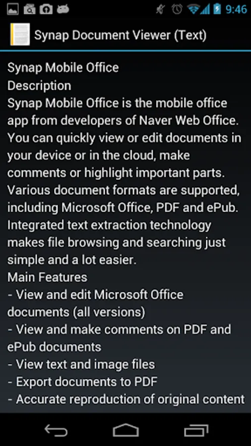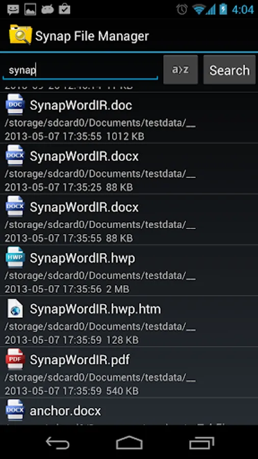 Synap File Manager is an intelligent file manager app with keyword search enabled. Type a word and search files for keyword in content, metadata or file name. Integrated text extraction technology makes file browsing and searching just simple and a lot easier. Search supported within MS Office, PDF, Text, HTML, MP3 and E-mail files. Bundled text viewer lets you quickly scan text content of a document.