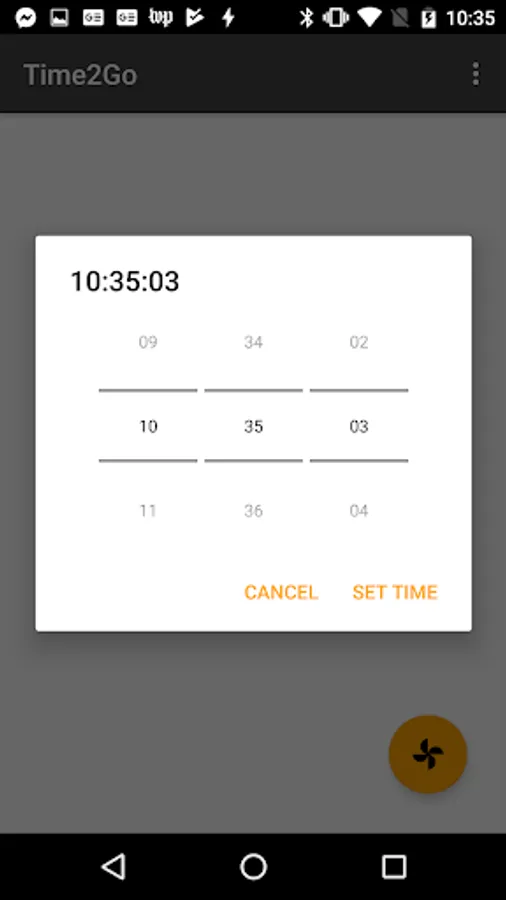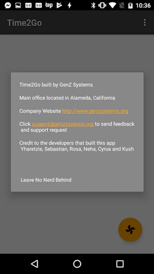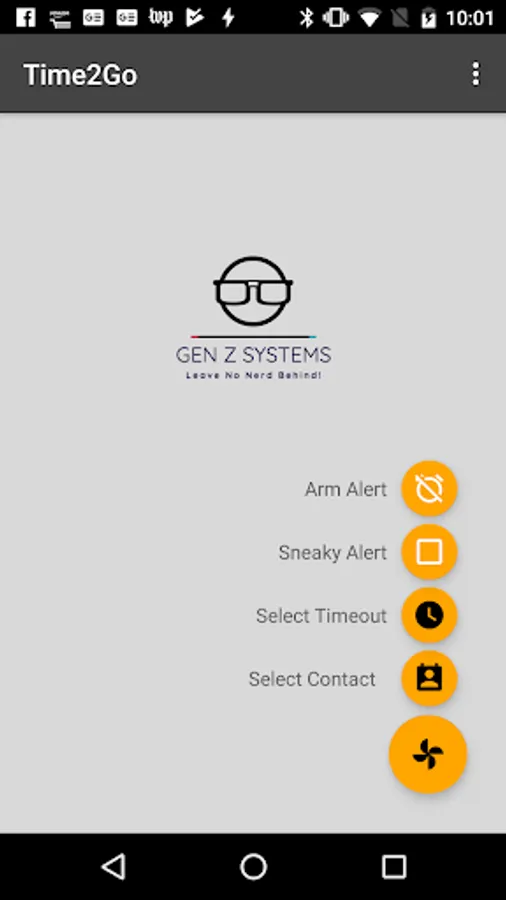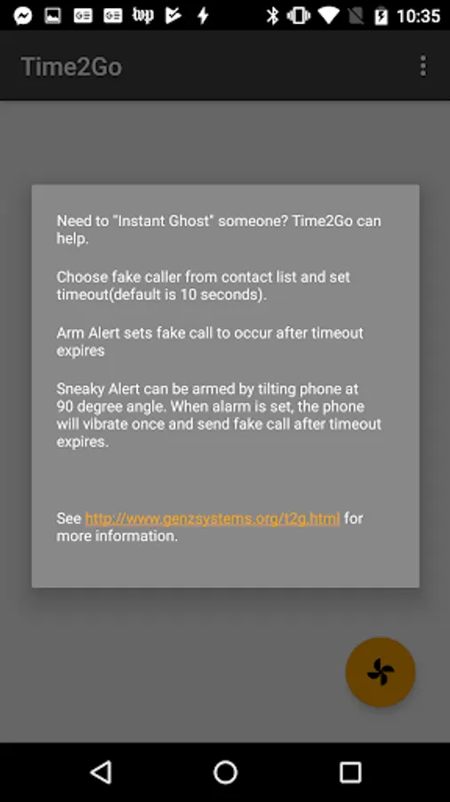 Time2Go is a simple smartphone application that allows user to select a phone contact, set a timeout and arm an alert that sends a fake phone call. The application will ask user for permission to review phone contacts list. The application also has a feature where a "sneaky alarm" can be set by tilting the phone at a 90 degree angle. When the "sneaky alarm" is set, the smartphone will vibrate once.