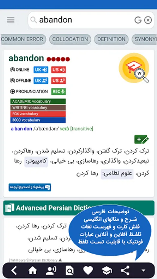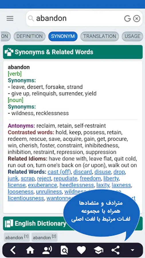 دیگر نیازی به خرید چندین لغت نامه نیست! كافیست پس از اجرای ok برنامه TDictionary ، لغت انگلیسی مورد نظر را وارد نمایید تا ضمن گوش دادن به تلفظ آن ، معنی فارسی ، كلمات مترادف ، کاربرد لغت در Speaking و Writing ، لغات ضروری آزمون تافل ، لغات ضروری آزمون آیلتس ، مجموعه 504 لغت کاربردی و ... را در یک صفحه ملاحظه نمایید.