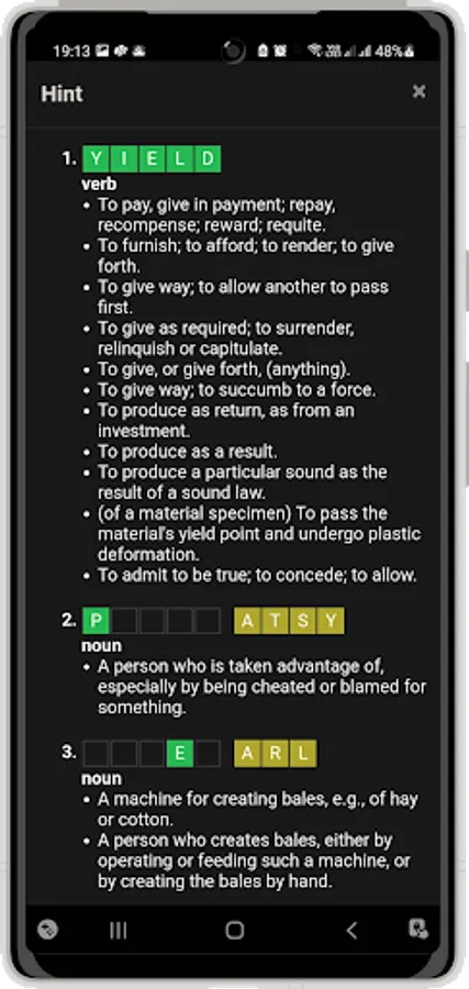- Word hints - Definition and summary of letters identified so far.
