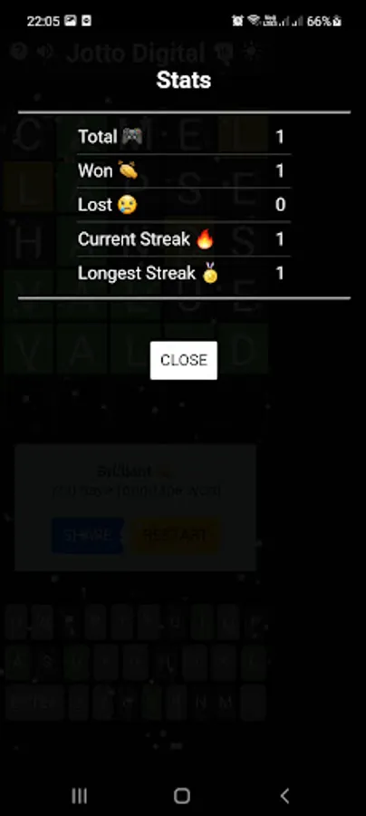 - Shows the statistics on total games, wins and losses, current streak, and longest streak.