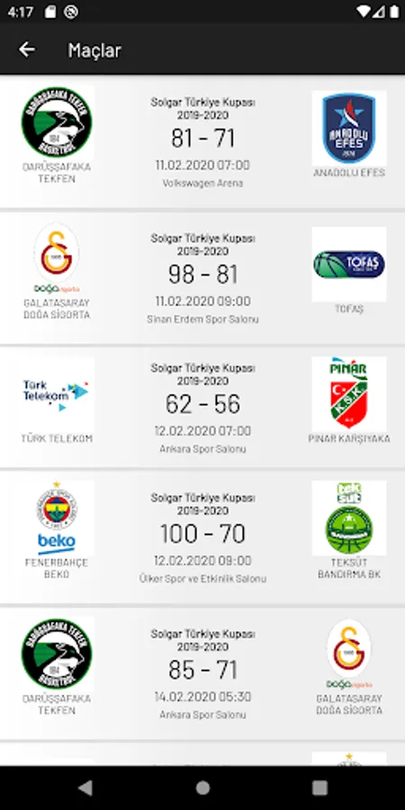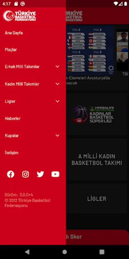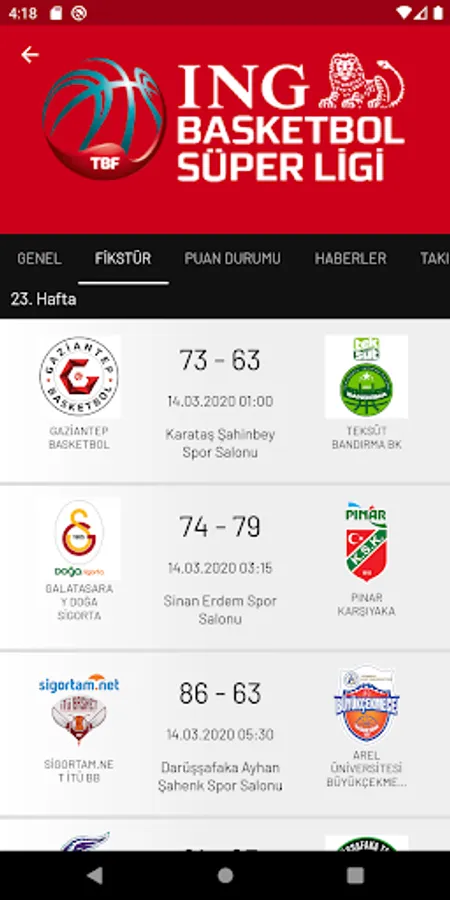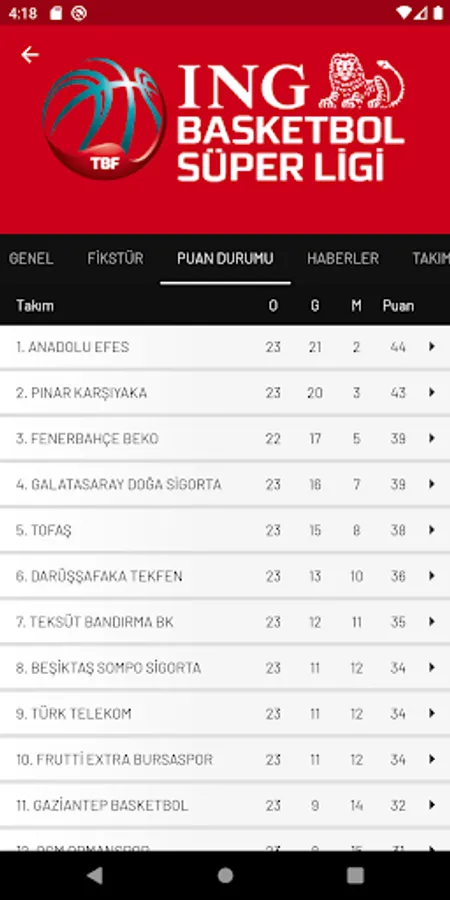 Turkey Basketball Federation Android app with live scores for all leagues and cups are organized by TBF, fixtures, standings, announcements, statistical leaders, your favorite team and your statistics related to your players, all developments related to the national team and our much more now in your pocket!