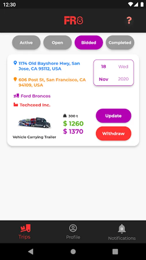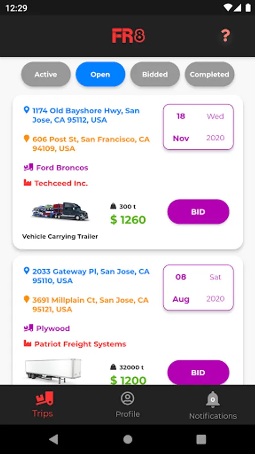 Fr8 mobile app is for FR8 carriers to setup their account and co-ordinate trips that are initiated by FR8 shippers.