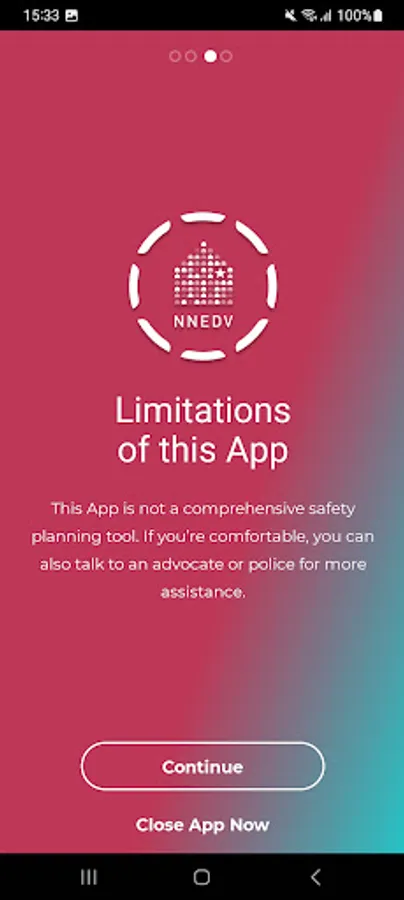 Although this app contains safety and privacy tips, this app is not meant to be a comprehensive safety planning tool. Please speak with a domestic violence or sexual assault advocate to share what is happening to you and discuss your safety and privacy strategies.