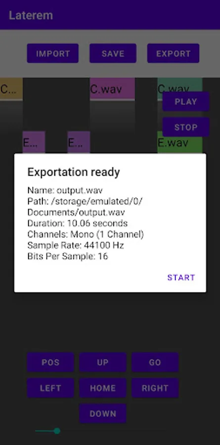 3. Test the result with PLAY button. Export the result with EXPORT button. (Example: write out.wav as filename; the results are in Musics folder.)