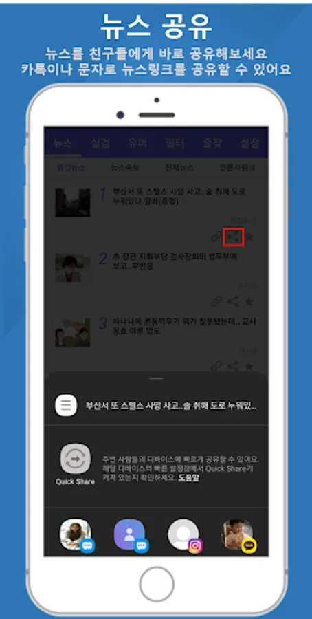 a) 컨텐츠 하단 공유버튼을 누르면 친구들에게 카톡/문자로 뉴스 공유 가능