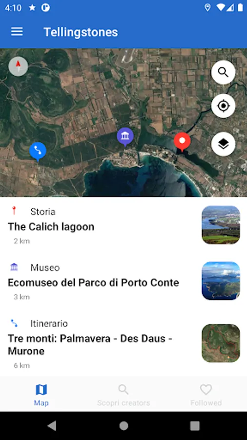 It is possible to publish geo-referenced contents that indicate places of interest, represented on the Tellingstones App as actionable icons that refer to in-depth information sheets,