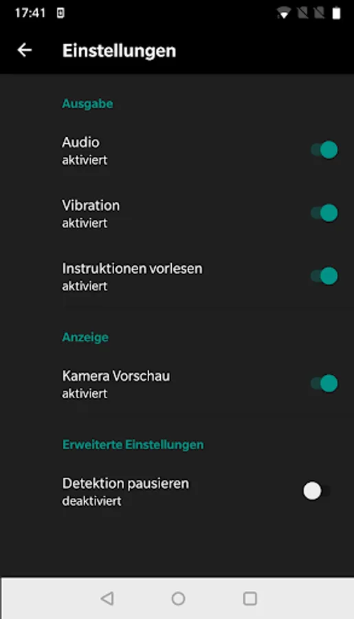 In the settings you can switch the voice output and the vibration on and off. In addition, the camera preview can be deactivated here. If this is deactivated, the traffic light pilot shows you the recognized traffic light phase on the entire screen in red or green, a gray screen does not represent a recognized traffic light phase.