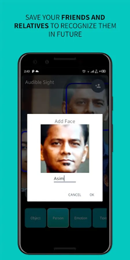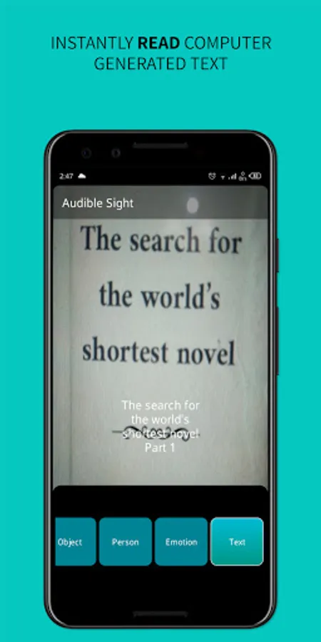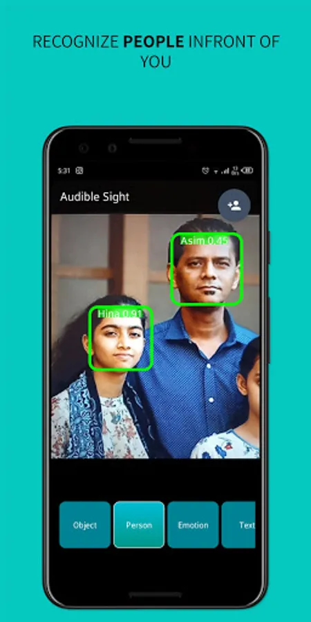 Audible Sight is an assistive mobile application which is designed for Pakistan’s visually impaired people. Audible Sight is providing guidance in Urdu Language as it is the national language of Pakistan. This Application is aimed to help the blind to be more aware of their surroundings and regain their independence. The features included in application are Object Detection, Person Identification, Emotion Recognition, Color Recognition and Text Reading with real time processing and speech input support. Audible Sight is providing all these features at one spot by improving blind mobility and enabling them to monitor their environments by holding on to a single application.