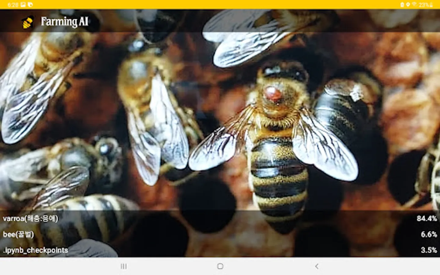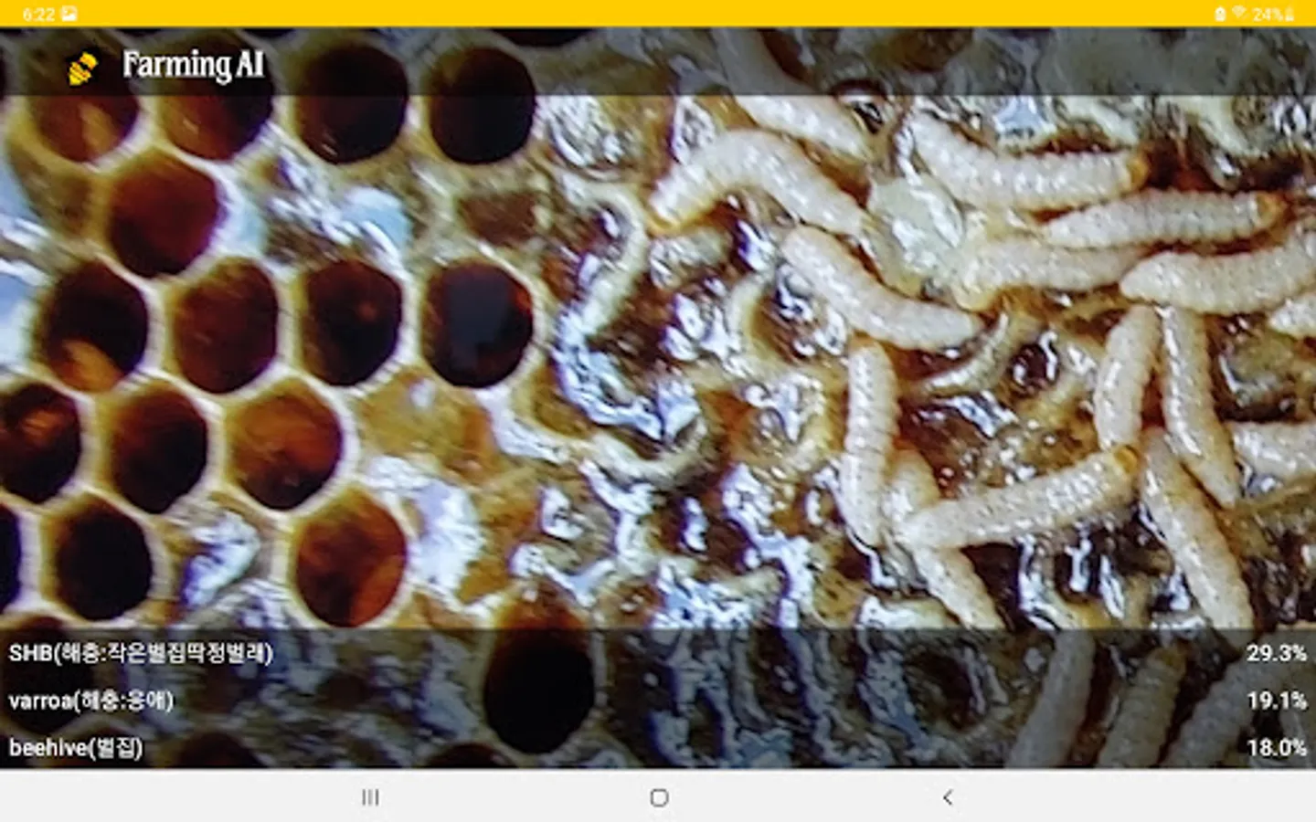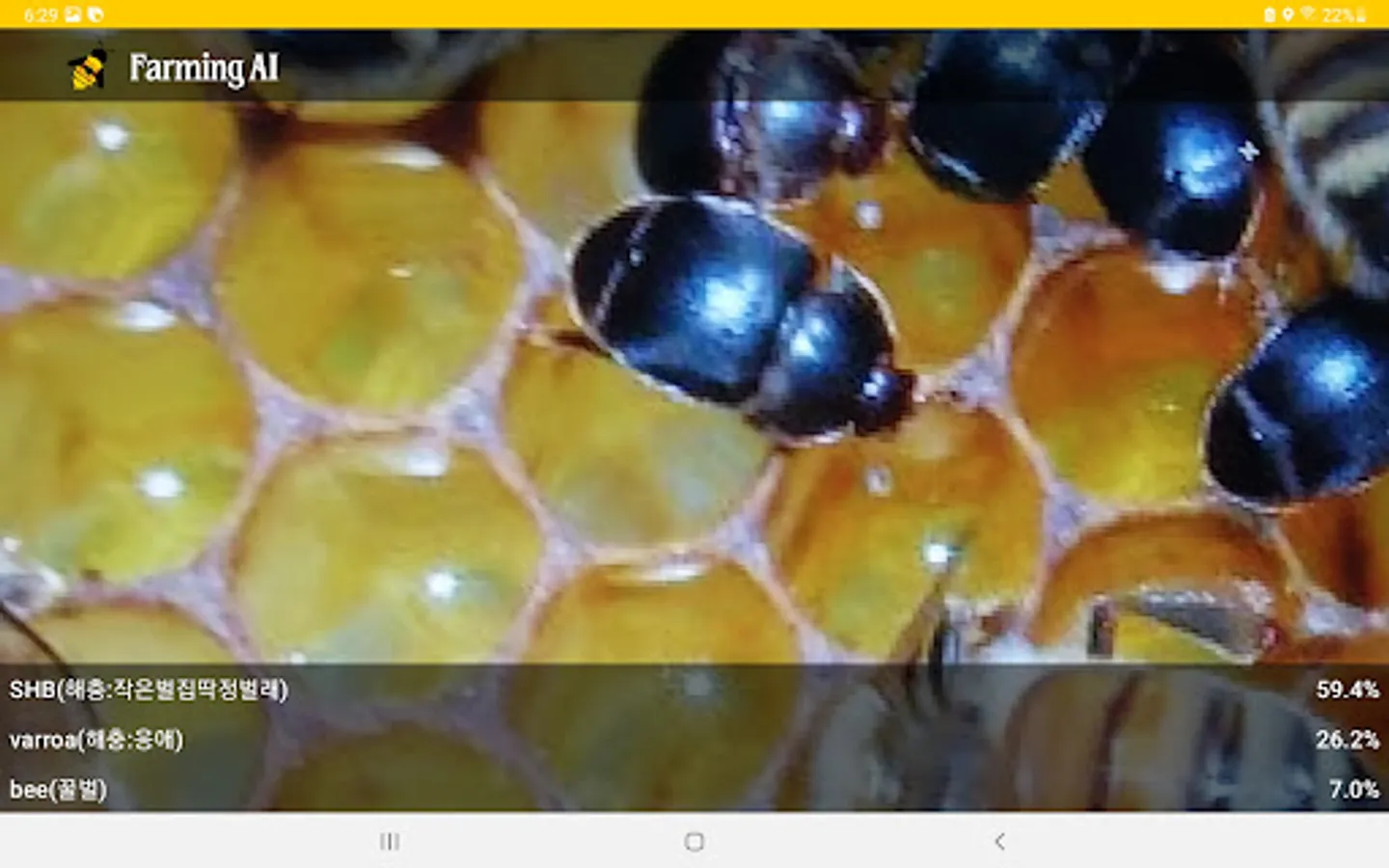 The beekeeping pest diagnosis and beekeeping equipment recognition app uses real-time camera information processing and deep learning technology to diagnose pests and pests. For example, it is possible to diagnose 'varroa mite', 'small beehive beetle (SHB)', and 'wap', which are beekeeping pests. It can also recognize various beekeeping equipment. Click and open the app while the camera works in real time. If you get as close as possible, you will know the name of the pest. Accuracy may decrease depending on sunlight or shade. As the camera continues to operate, please turn off the app when not in use. thank you.