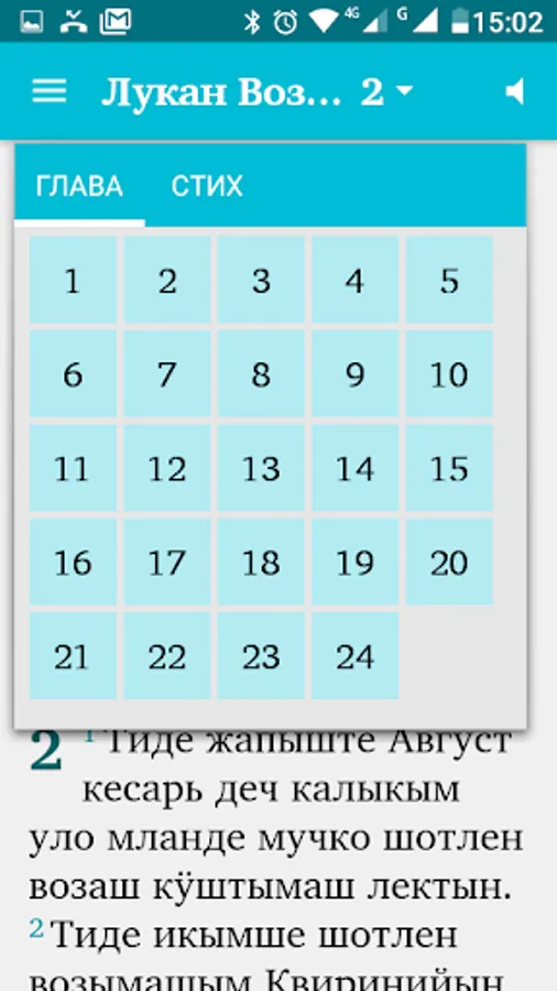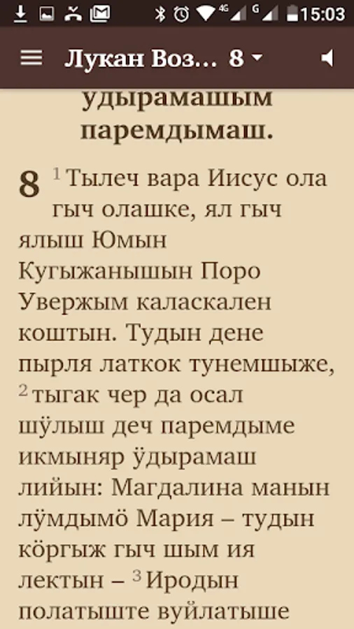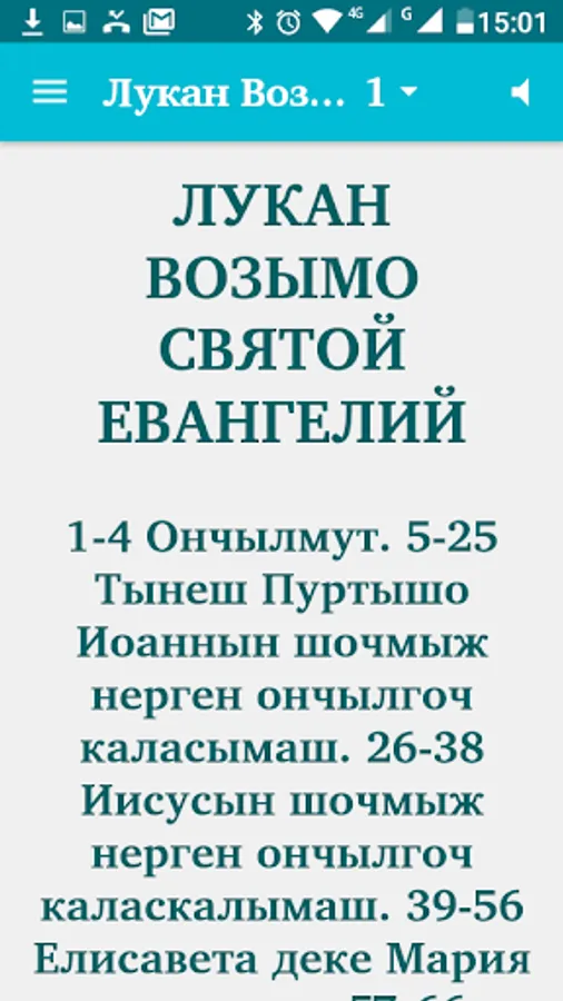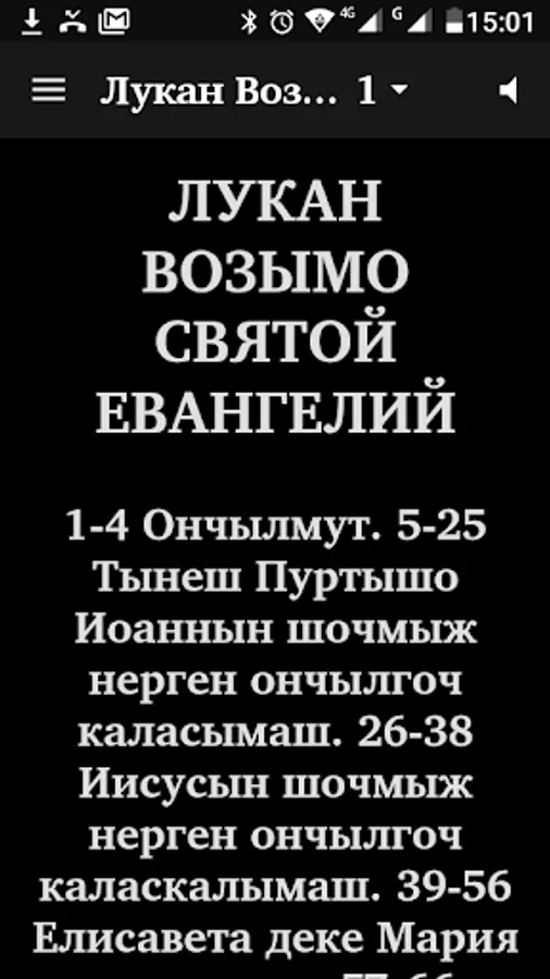 This app is designed for reading the biblical text in the Mari language. The text is accompanied by audio dubbing.