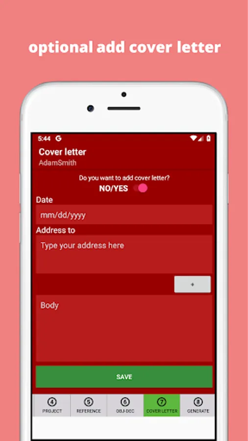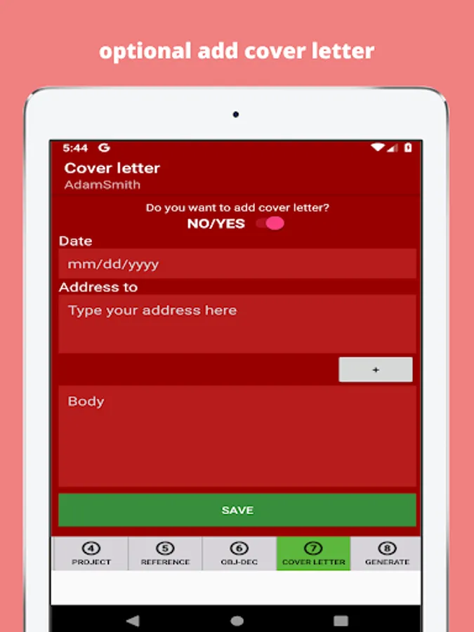 If you want to include the cover letter in your CV, select "Yes" and fill in the information. Your preview will be added to the pdf download screen.