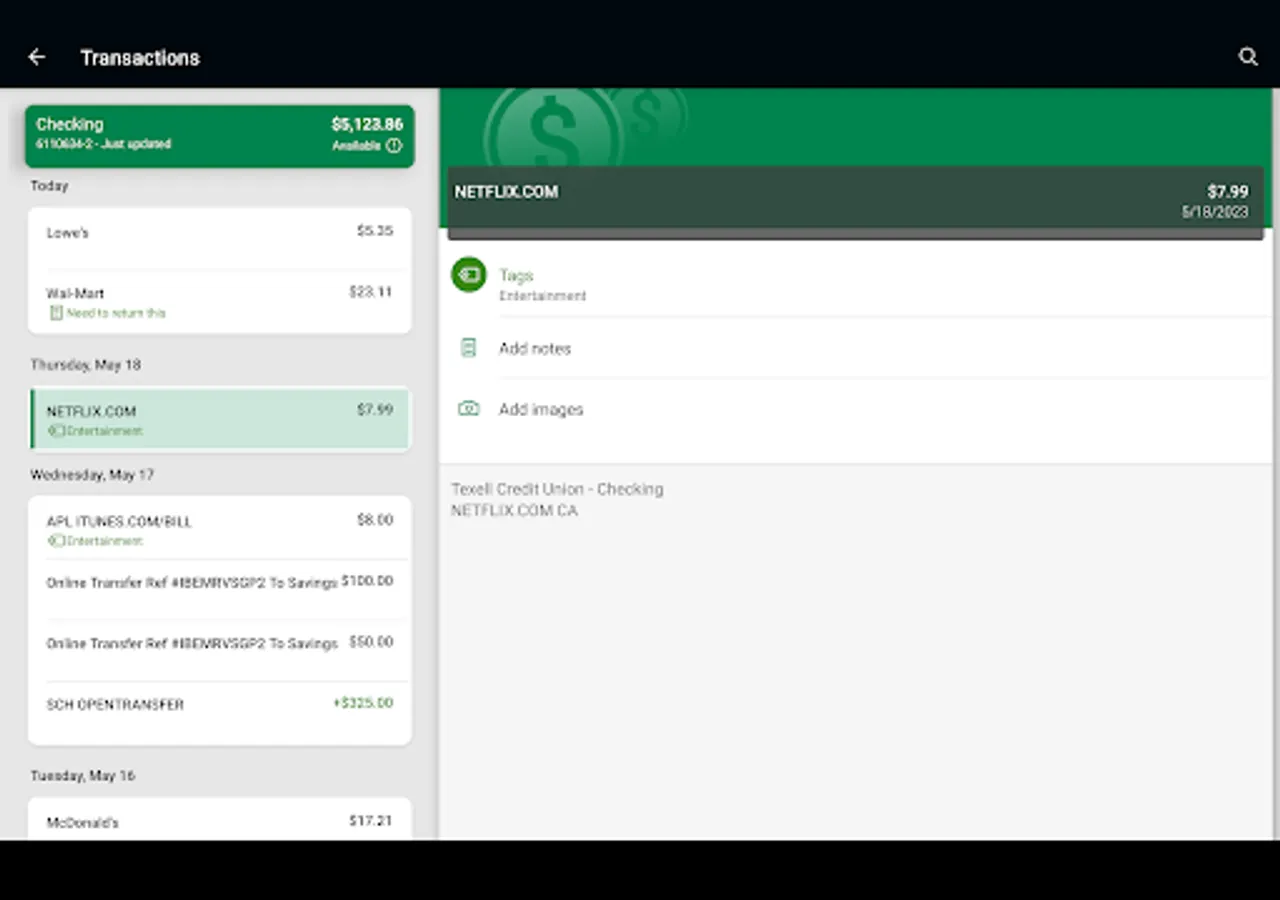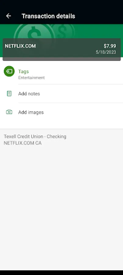 · Keep your transactions organized by allowing you to add tags, notes, and photos of receipts and checks.