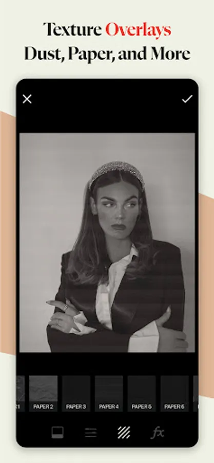 Add texture and dimension to your photos with overlays like Paper, Dust, Light, Plastic, Shadows, and more.