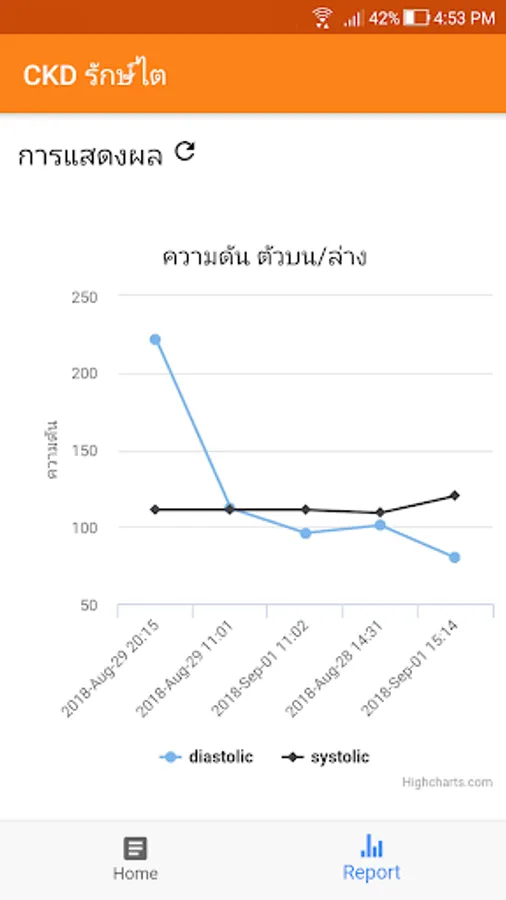 CKD Pro application for health information recordings. Appropriate for general population, diabetes, hypertension and chronic kidney disease patients. Users can record basic health information including blood pressure, heart rate, blood sugar level, height, weight and renal function. Kidney diseases patients on dialysis able to record more information such as dialysis records, pictures and remaining of dialysate solution which will be sent to physicians via www.thaicarecloud.org for monitoring and treatment adjustment.