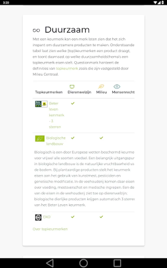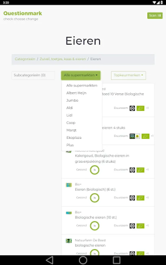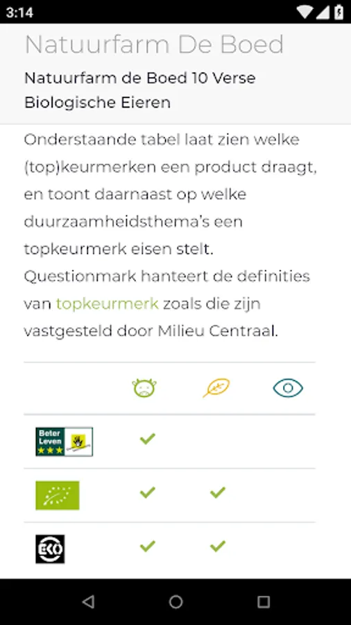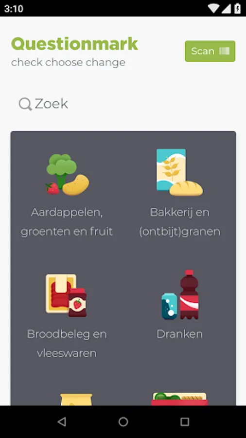 Do you want to do sustainable and healthy shopping? Questionmark helps! The free app shows you which (top) quality marks have a product on the sustainability themes environment, human rights and animal welfare. In addition, the app assesses whether the product fits within a healthy diet. You can scan or look up products.
