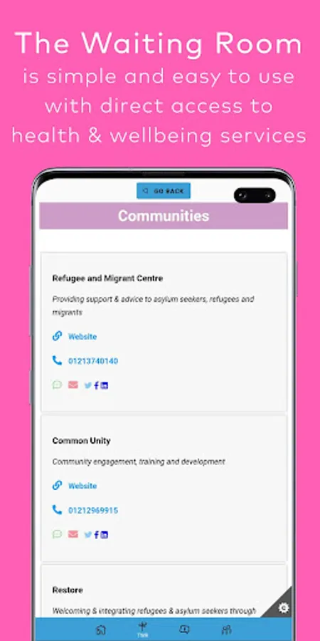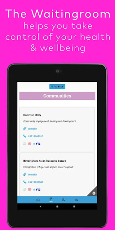 This app is dedicated to supporting the health and wellbeing of people living in Birmingham and Solihull. It links you with local support and life enhancing services from across the area in the simplest way possible. The Waiting Room (TWR) is the one stop directory of support that puts health and wellbeing at your fingertips.