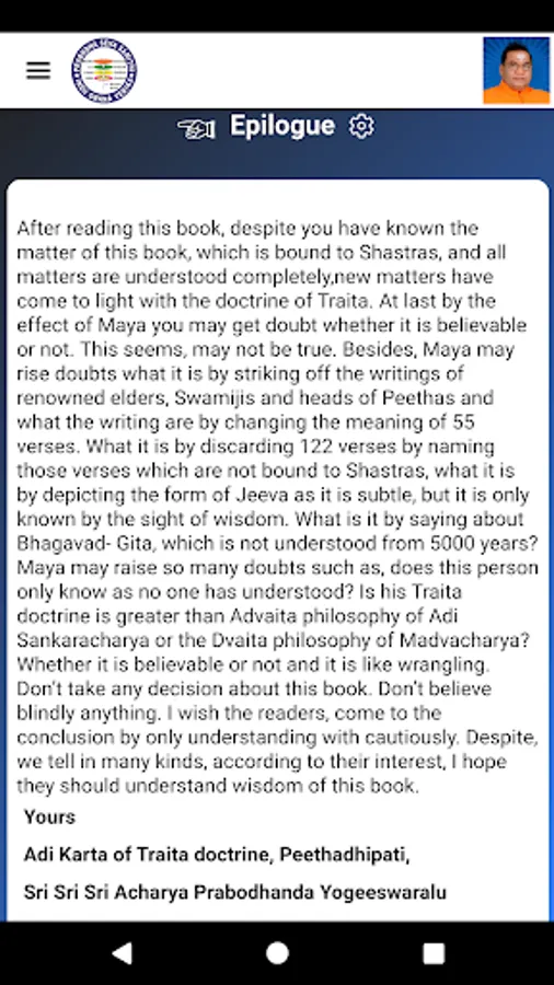 Writer: The only Guru of three religions(Hindu, Muslim, Christian), The Emperor of Spiritual Kingdom, The writer of more than hundred divine holy books, Indu Gnana Dharma Pradata, The Sensational Writer, Adi Karta of Traita Doctrine , Sri Sri Sri Acharya Prabodhananda Yogeeswarulu