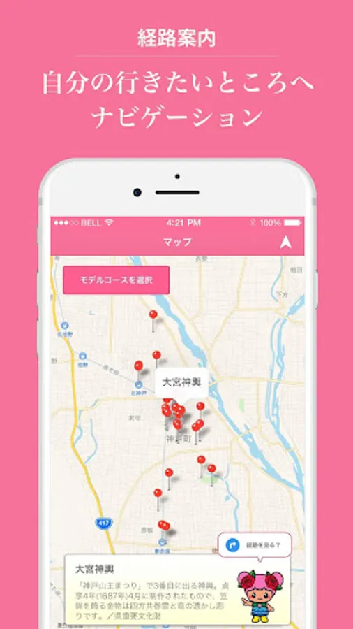 ・「ごうど観光交流館「ひよしの里」」、「美しい薔薇が咲く、ばら公園いこいの広場」、「山王まつりで有名な日吉神社」などの位置情報と詳しい説明の閲覧機能