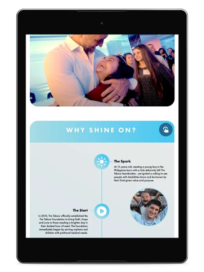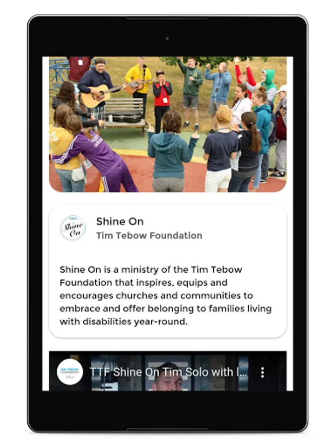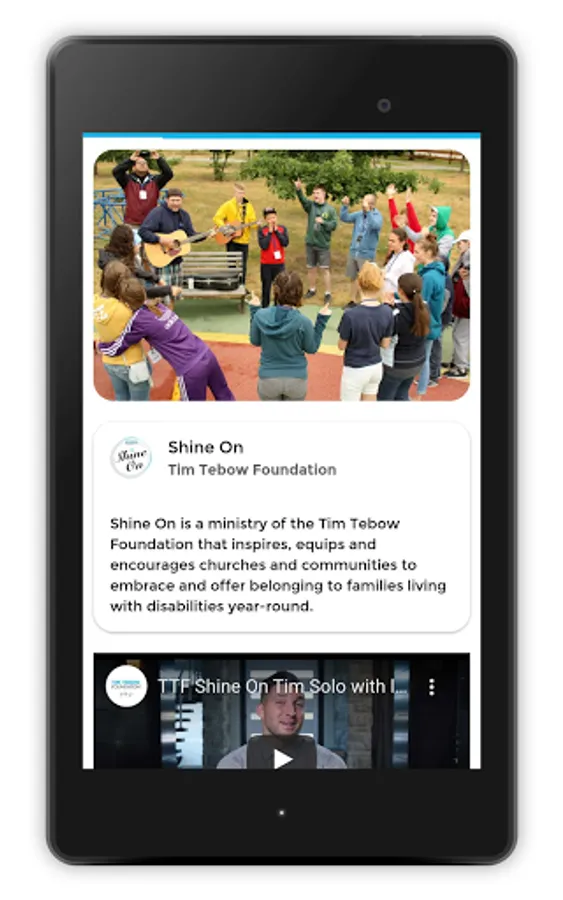 Shine On is a ministry of the Tim Tebow Foundation that inspires, equips and encourages churches and communities to embrace and offer belonging to families living with disabilities year-round.