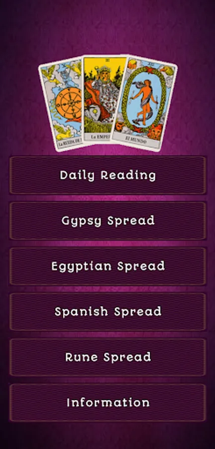 "Tarot Card Reading" is an application that will allow you to address life questions that concern you. It's the only app that offers various types of spreads tailored to specific inquiries. Currently, we have the following spreads available: