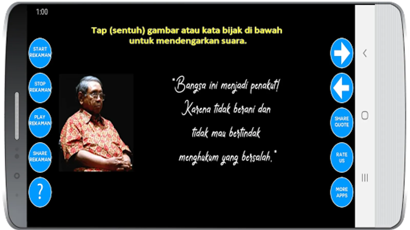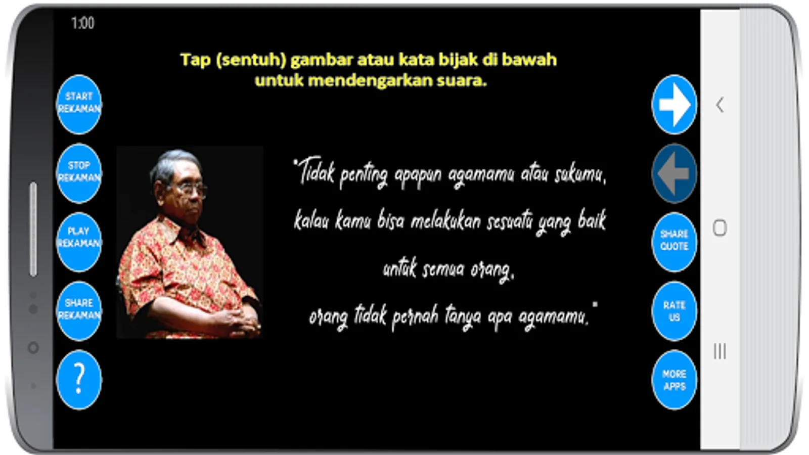 Gus Dur's Collection of Words of Wisdom (his real name: Abdurrahman Wahid) is an application that contains a collection of wise words / quotes / pearls ever spoken by Gus Dur.