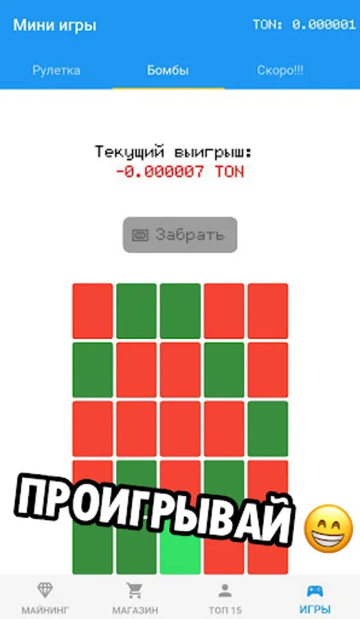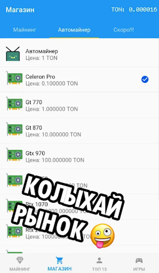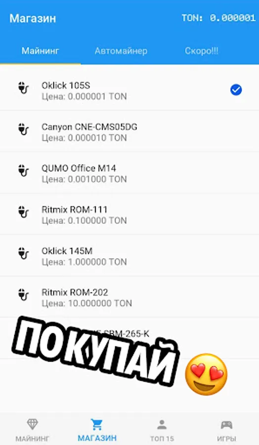 (Валюта, используемая внутри приложения не является частью криптовалюты TON)