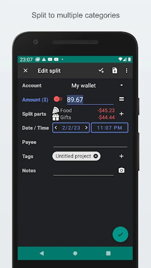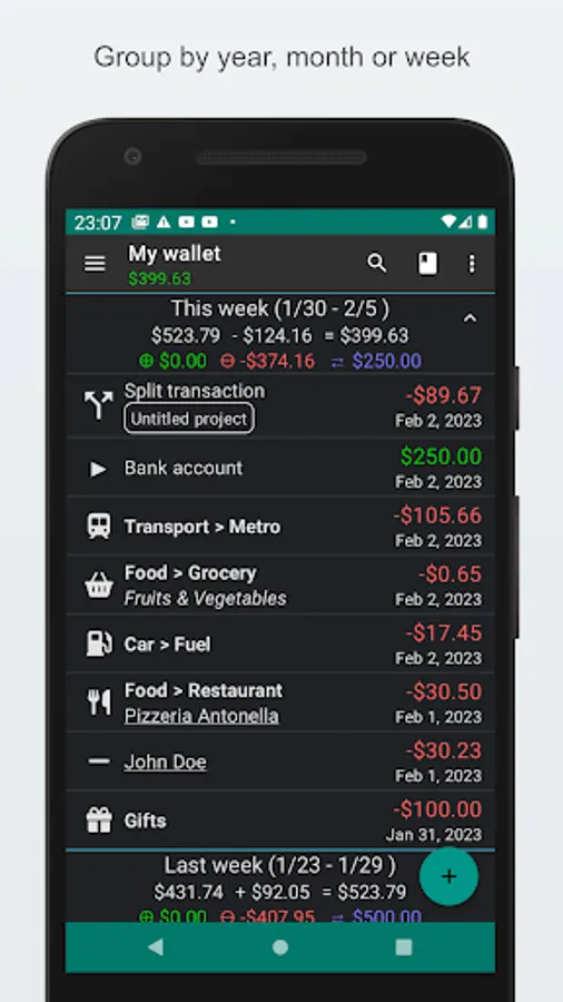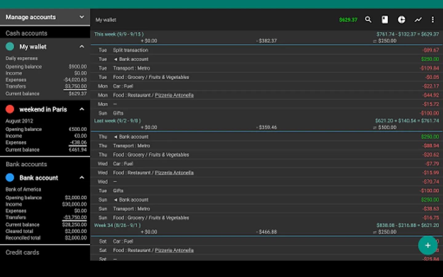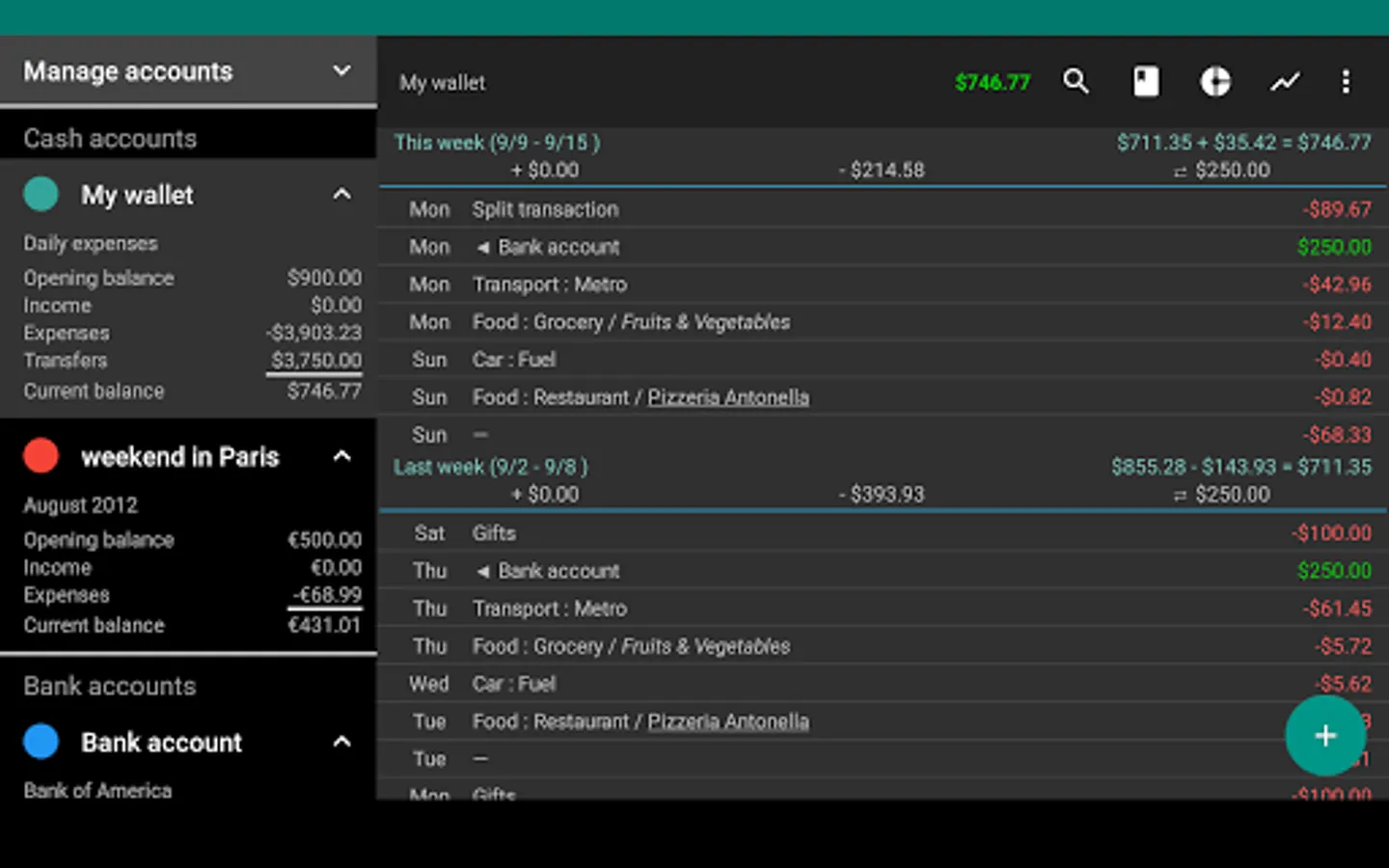 - Split transaction: A single transaction can be split into multiple parts (categories and transfers)