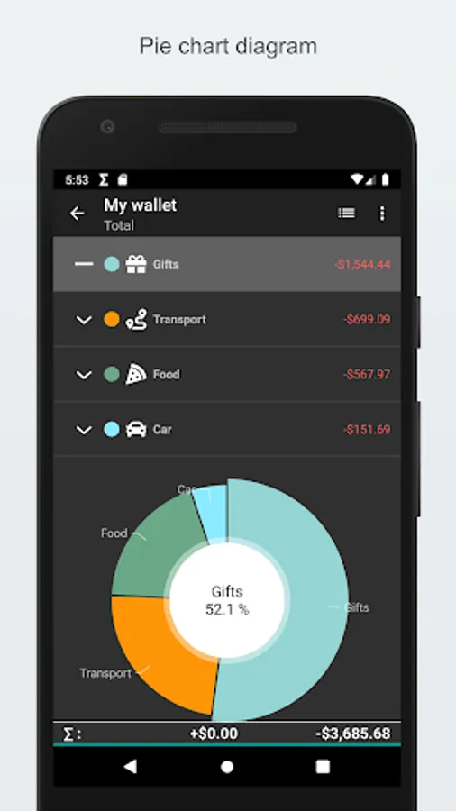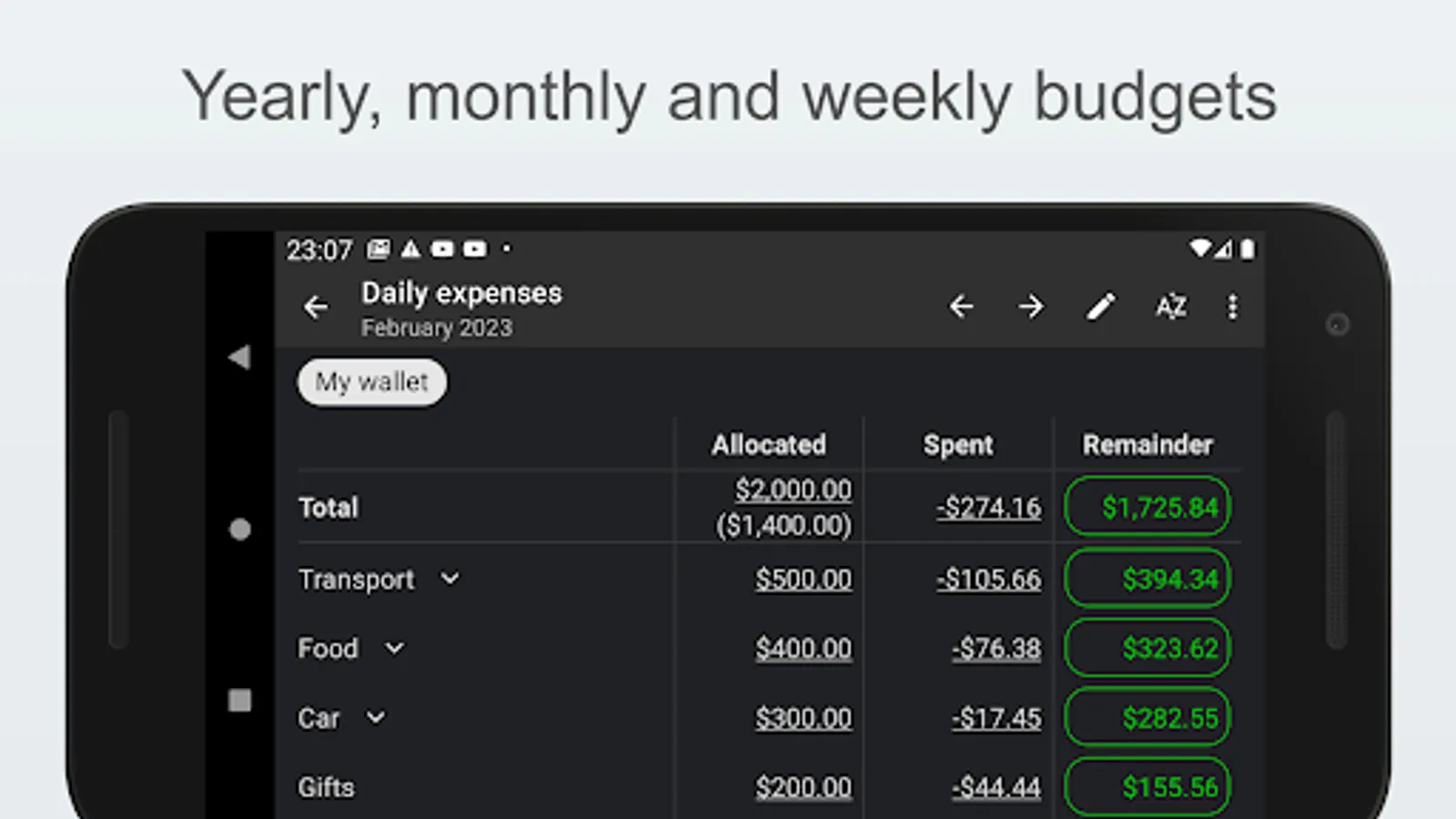 - Budgeting: Compare your spending to limits you set per category on a daily, weekly, monthly or yearly basis.