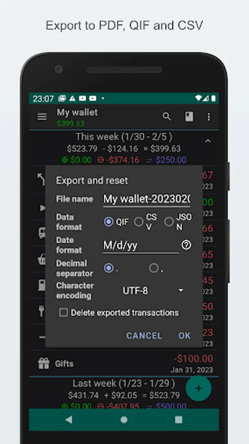- Export to QIF and CSV. Import from QIF