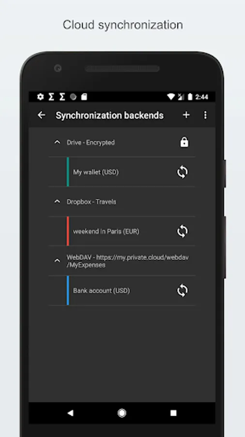 - Cloud synchronization: Data can be synced between multiple devices (Webdav, Dropbox, Google Drive)
