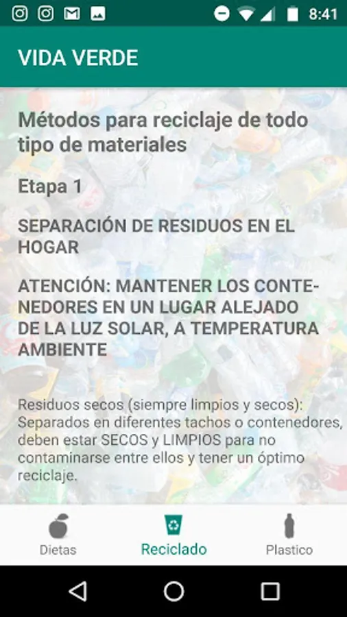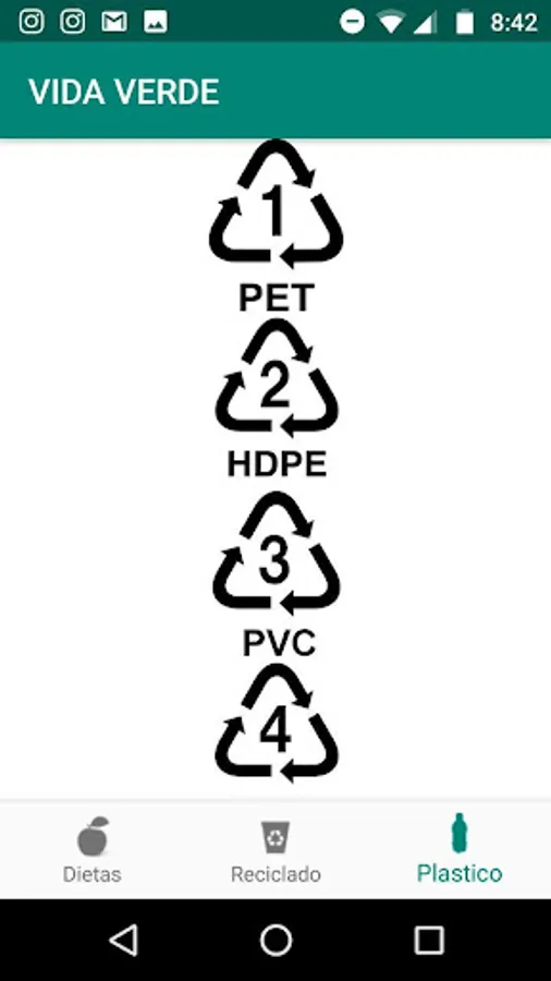Eco-friendly application. Find out about healthy diets, how to recycle and the different types of plastics.