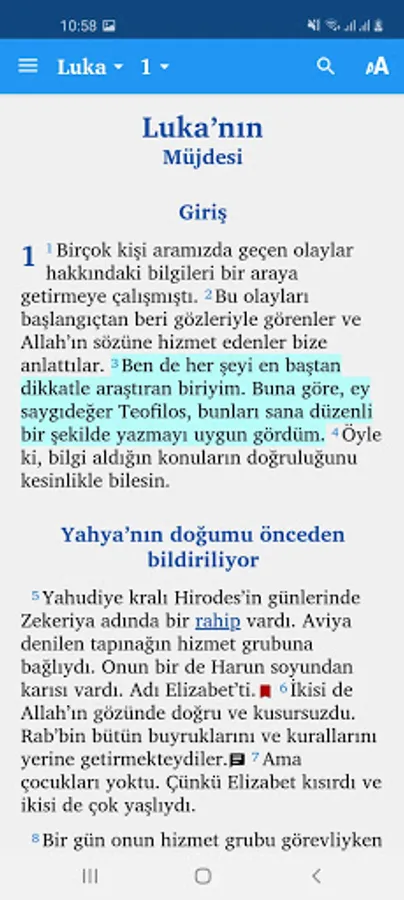 Words in the text that may be unfamiliar to the reader are underlined. Touching such a word opens a window in which the word is explained. Small underlined letters indicate a footnote. Touching the the letter will open the footnote. The footnote will give an explanation or the reference to another Bible verse which has similar content or is the original place where a quoted text comes from.