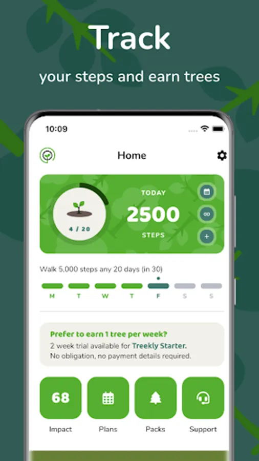 With Treekly, you earn trees by maintaining a daily walking habit of over 5000 steps. Take a positive step today for a healthier future on a happier planet.