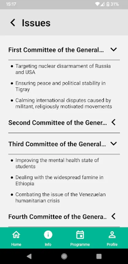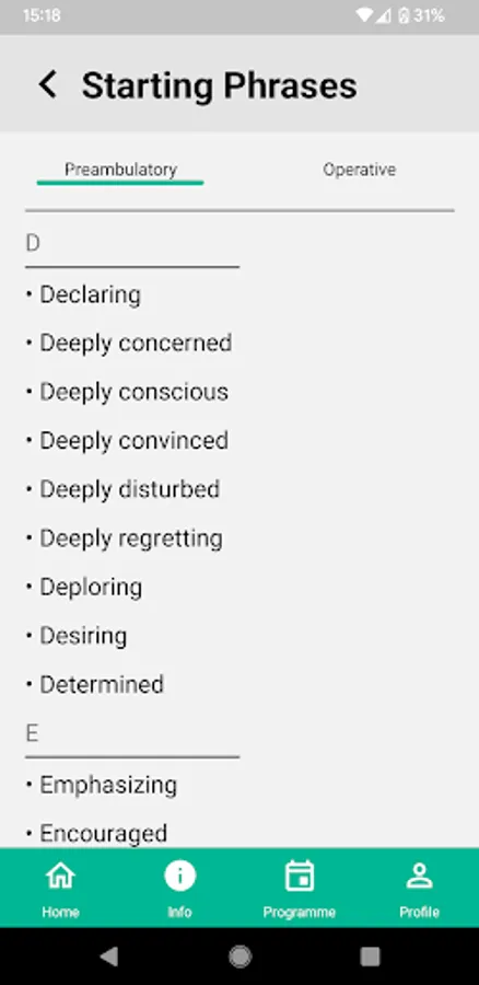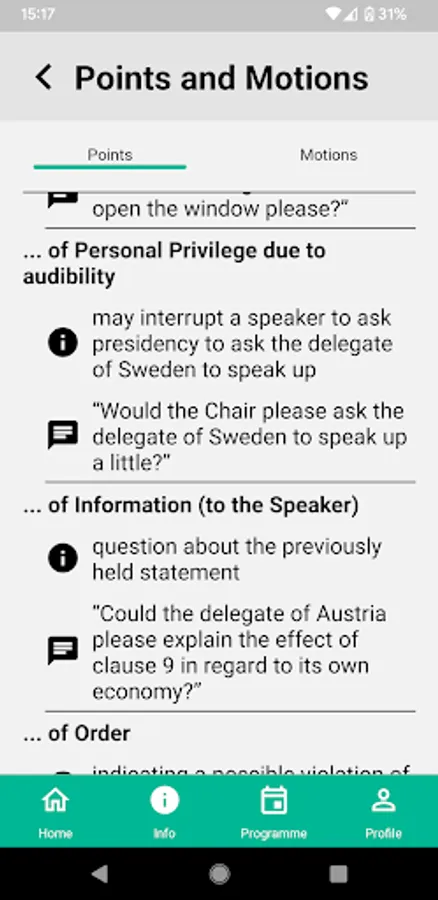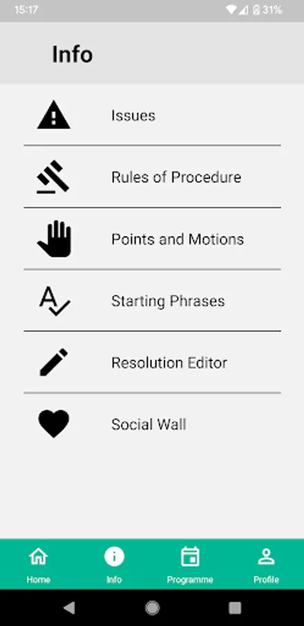 It includes the Programme of Events and Issues on the Agenda. During Lobbying and Debate useful features like Starting Phrases, Rules of Procedure and Points & Motions will help you. You can also read up on the latest MUNOL happenings in the news section on your home screen. The app now includes a digital badge, so you don't need to worry about bringing your badge to evening events.