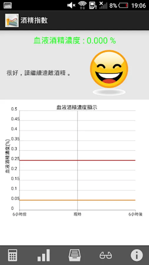 本應用程式只能估算血液中酒精含量(BAC)只供參考之用,有關資料並不能作為任何舉證或推翻任何執法機構的酒精測試(包括但不限於呼氣、血液和尿液)結果之用;而實際的血液中酒精含量(Actual BAC),會因應個人年齡、性別、體質及新陳代謝速度而有所不同,如需了解更多請向醫護人員查詢。