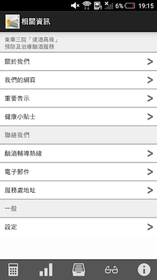 東華三院「遠酒高飛」預防及治療酗酒服務(T.W.G.Hs. “Stay Sober, Stay Free” Alcohol Prevention and Treatment Service)的「酒量計算」手機應用程 式,讓你輕鬆掌握酒精對身體的負面影響,以及留意飲用酒精飲品的份量。