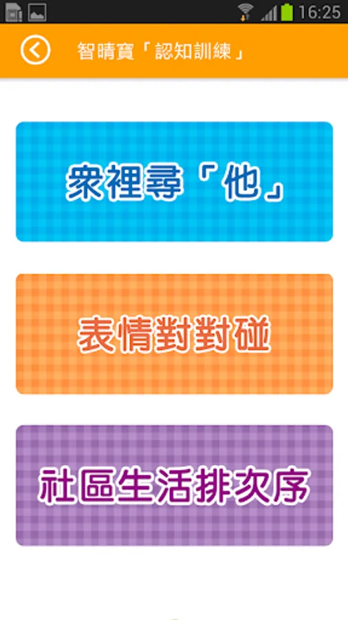 5. Cognitive Training – provides 3 different type of cognitive training games to enhance self-esteem among elders and delay their cognitive decline;