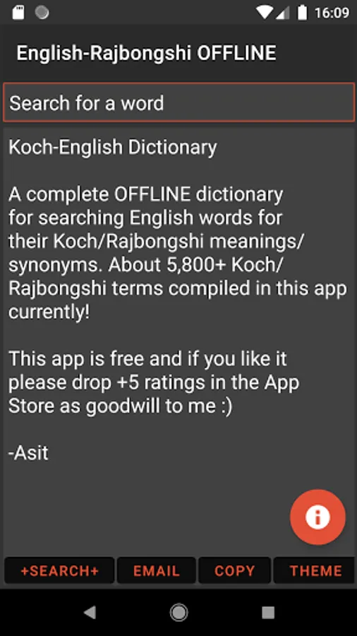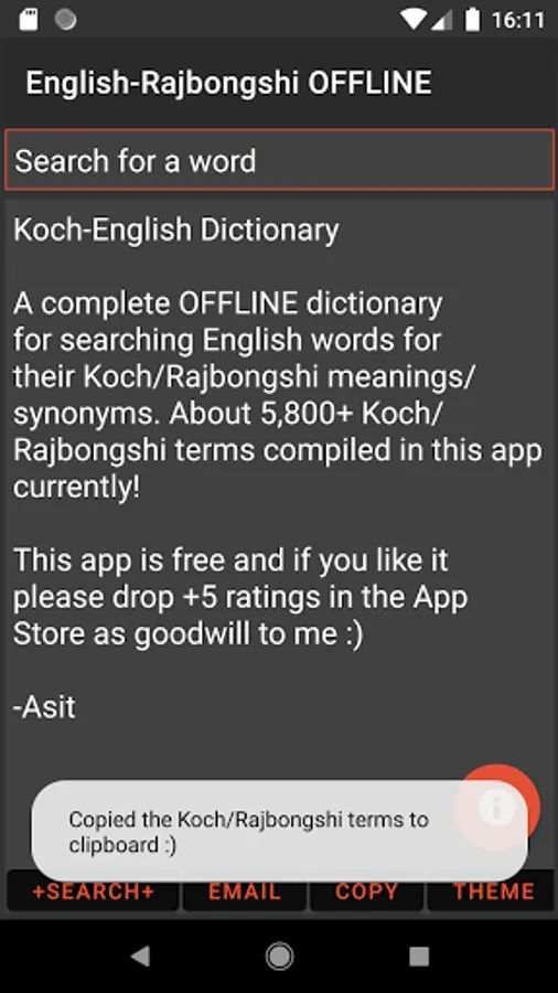 * Please feel free to contact us on our customer support email ID: asitb.applabs@gmail.com for any queries or concerns on this app. Please put this app's name "Koch-Rajbongshi Dictionary" on your email subject line so that we can understand that your email is for this app.