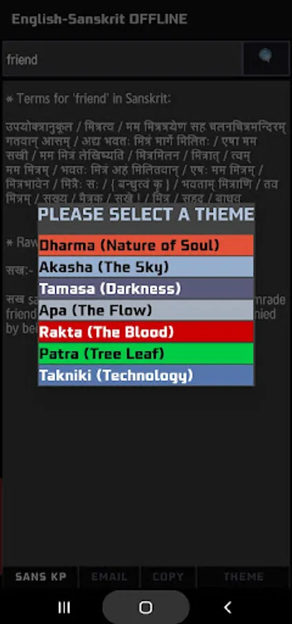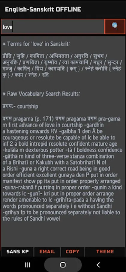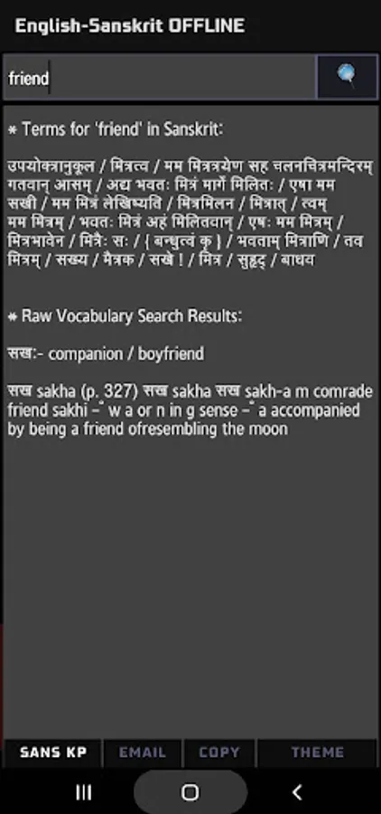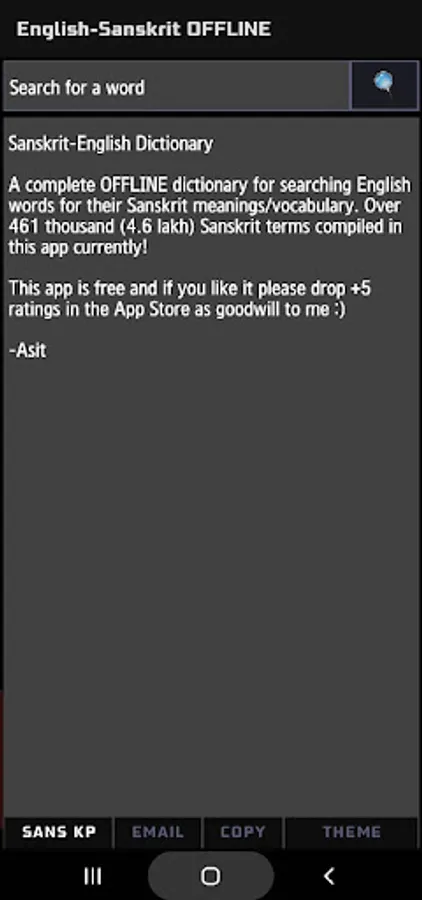 *** Please note that this is a dictionary (or a "thesaurus" to be more accurate). THIS IS NOT A SENTENCE TRANSLATOR!! You will get nowhere entering whole sentences in English/Sanskrit and expecting a translation. Sanskrit is a classical Indian language with varying interpretations and written forms, and adding the feature in an OFFLINE app would require gigabytes of space on your device to store the vocab and mnemonic database! That is why Google Translator is an ONLINE app. We have seen many people rating our app down because of this misunderstanding.