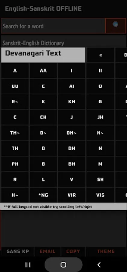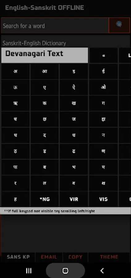 * Entering Devanagari text on the main screen search box using the Google Hindi keyboard will not work. You MUST use the Sanskrit to English Keypad for this feature.