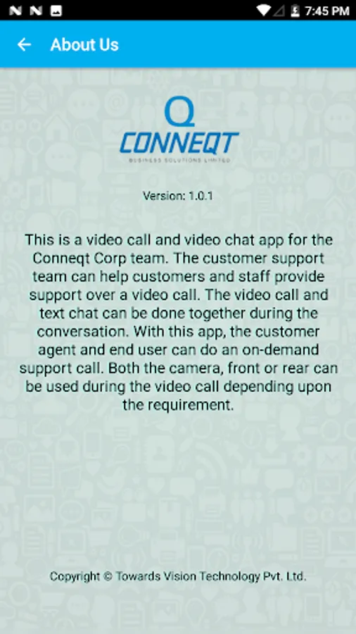 Conneqt VCall offers the end user to connect with the customer service team. The video call can be initiated by the service agent once the chat is connected. The app allows the user to start and stop the video feed, flip the from or rear camera and maximize and minimize the video. When the user moves to another app, while the video chat is active, a small video frame floats over the active app. In case the app is minimised and a new text message arrives, the notification panel alerts the user of new messages. The user can send and receive attachment during the video call.