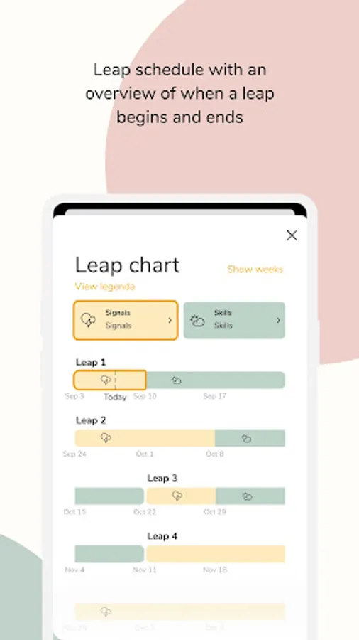 Especially for parenthood. The baby tracker for your baby’s leaps in their mental development. You can keep track of your baby’s milestones and your baby’s growth in our The Wonder Weeks! baby tracker. A leap for you and your baby.