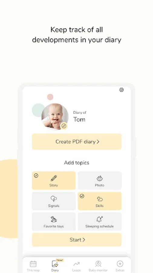 - Keep track of your baby’s development and milestones in the diary.