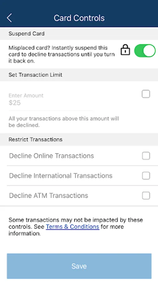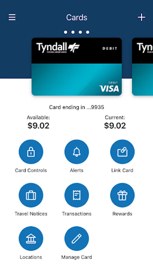The Tyndall Cards app puts card control in the palm of your hands and adds an extra layer of security. Monitor and manage your card from anywhere, at any time.