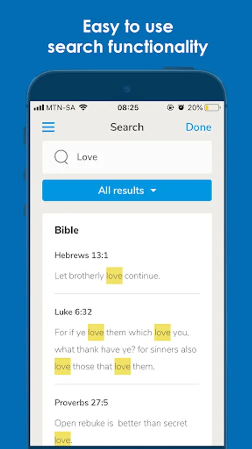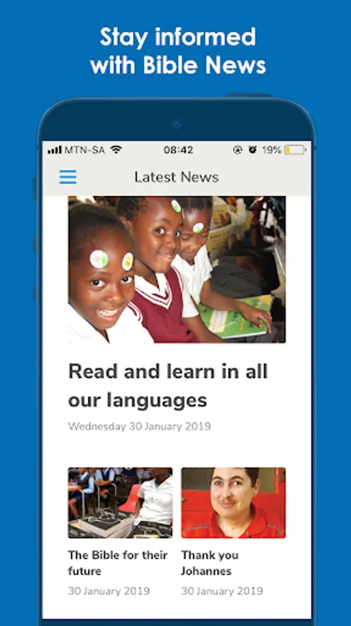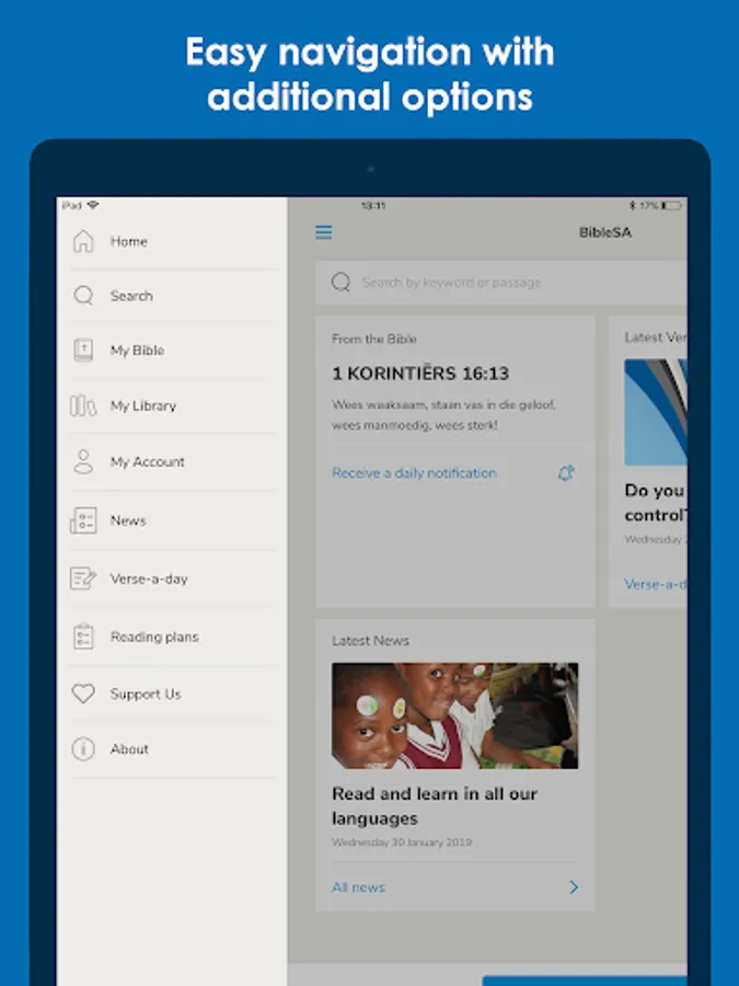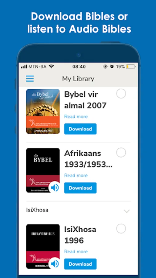 • Create your free BibleSA account to access more than 25 Bibles (online or to download) and audio Bibles in all 11 official languages (online).
