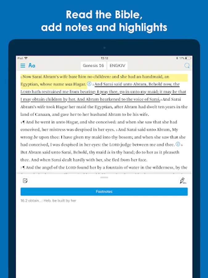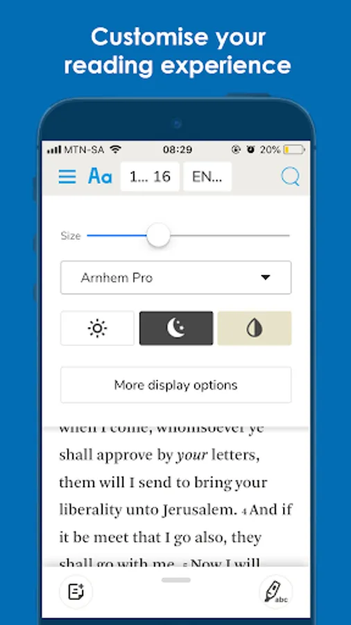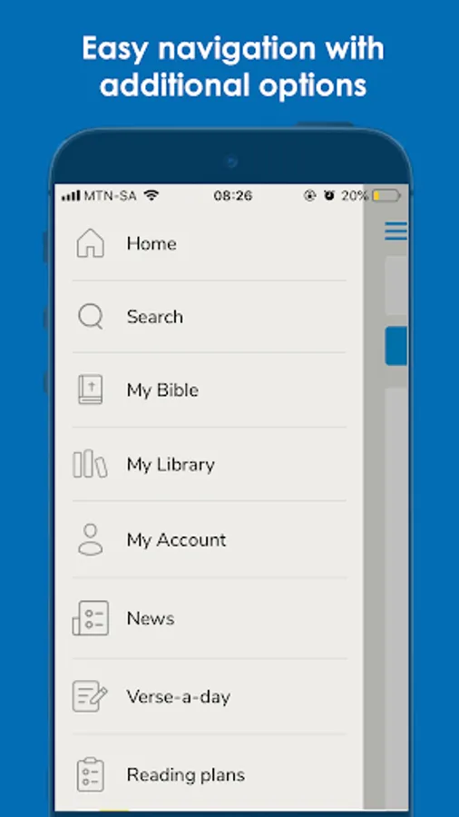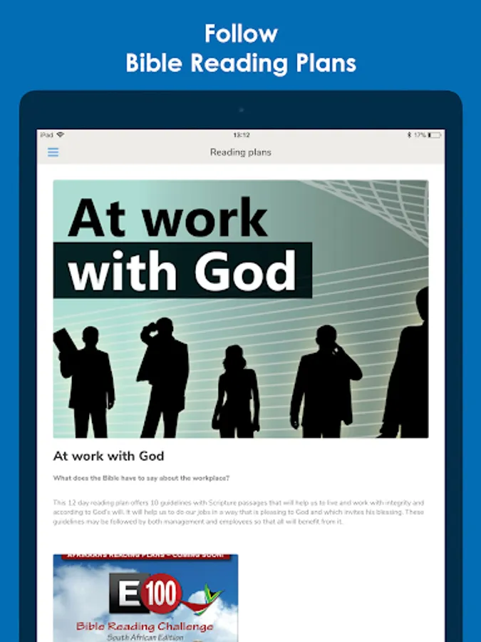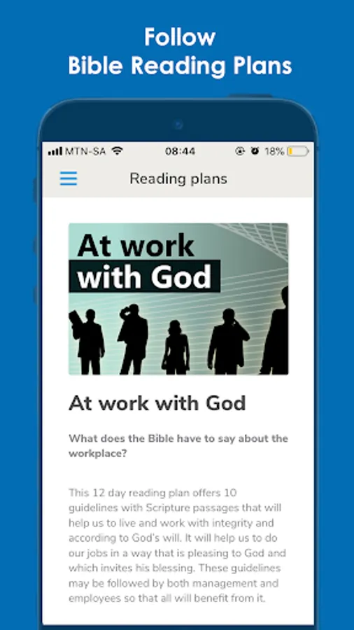 • Select reading plans to follow or receive a Bible verse on your phone every morning.