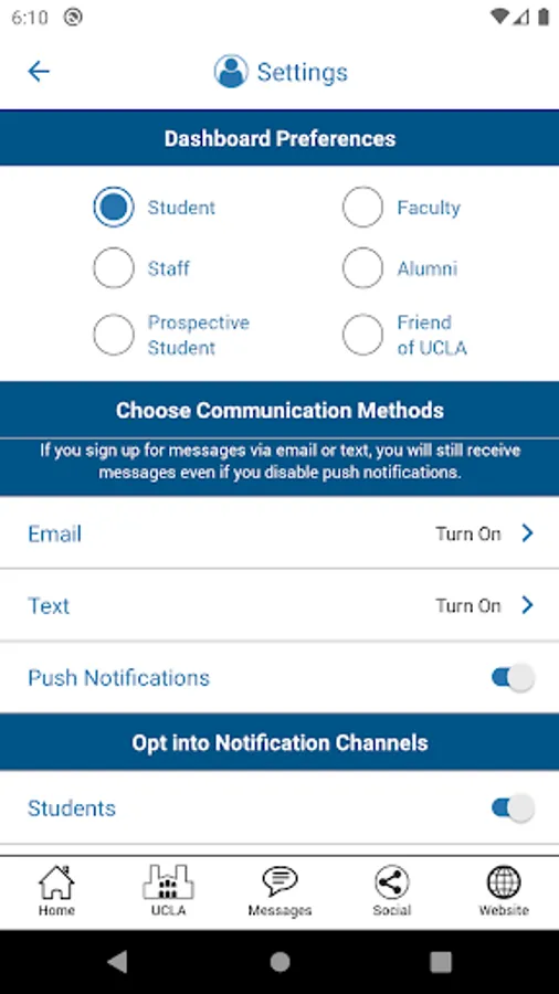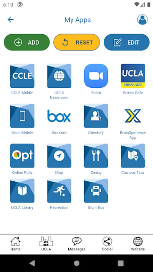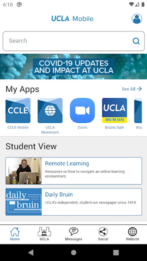 The UCLA mobile app is a mobile portal that blends UCLA content and resource links while also featuring UCLA's dynamic app landscape collected into a sliding Apps dashboard for the ease of UCLA's broad and diverse community. This allows the UCLA community to present a collection of UCLA's important apps while also allowing individuals to personalize their own dashboard with additional UCLA apps that they want to include in their UCLA mobile app environment. The app features app to app launches so that users have quick access into all of UCLA's native apps, listed in the UCLA app catalog.