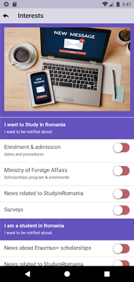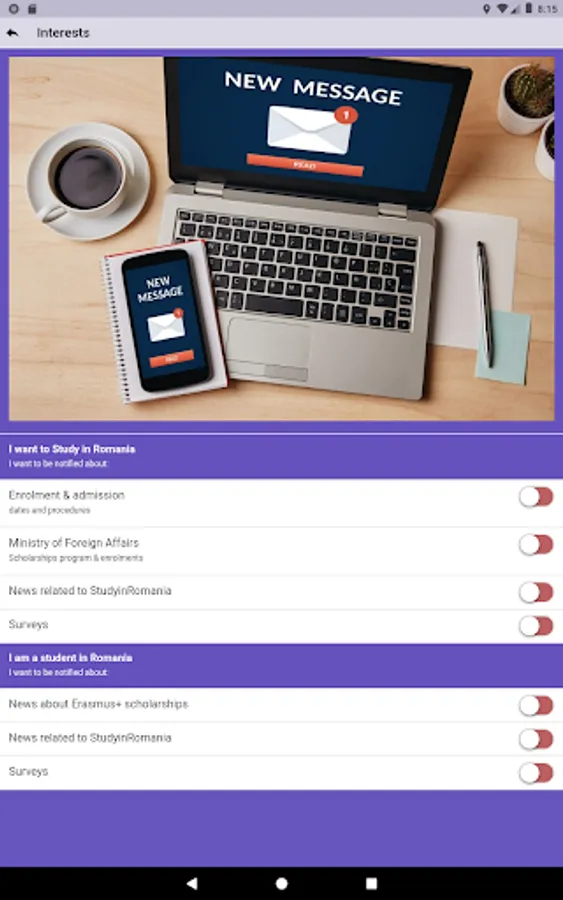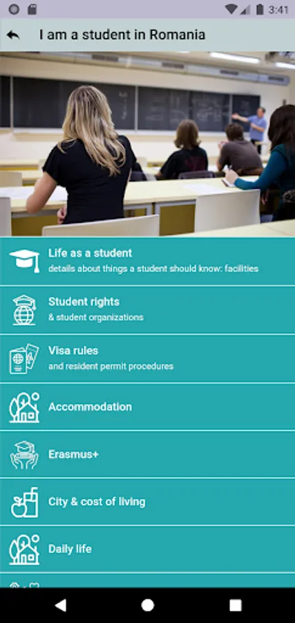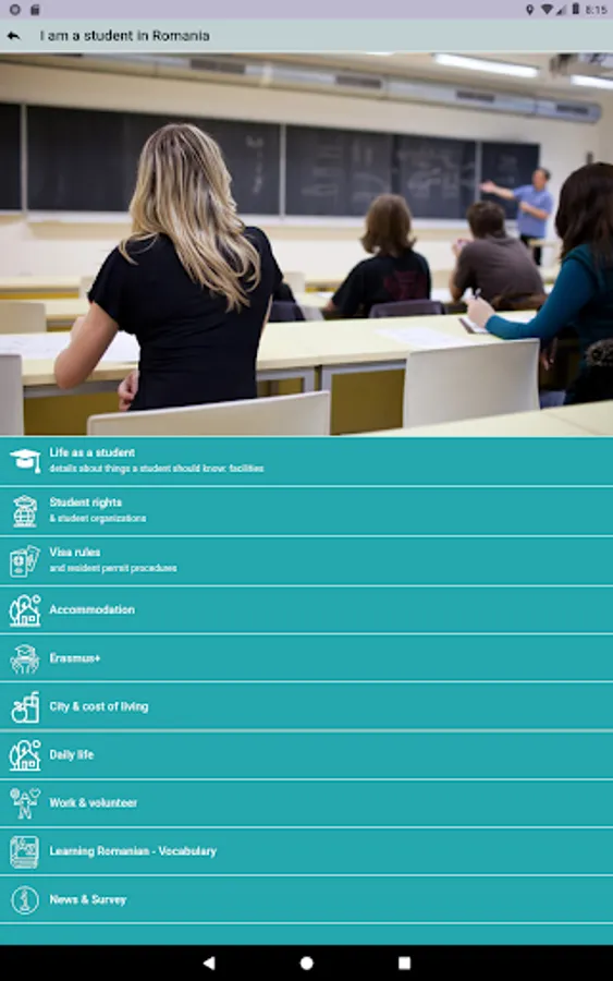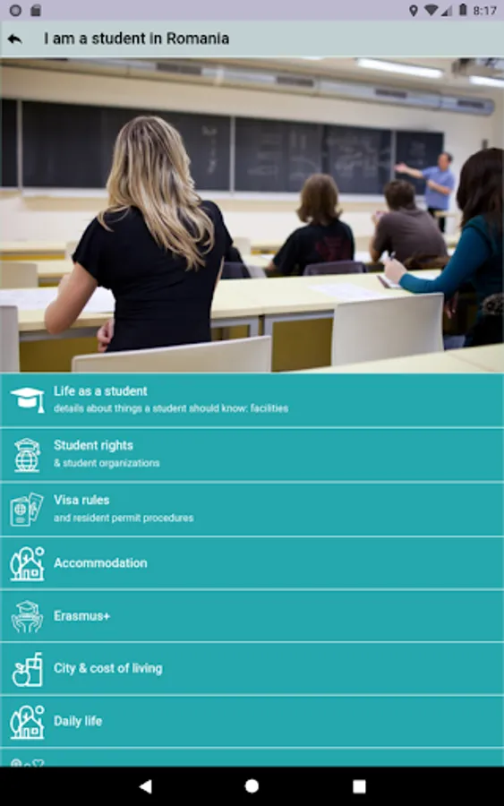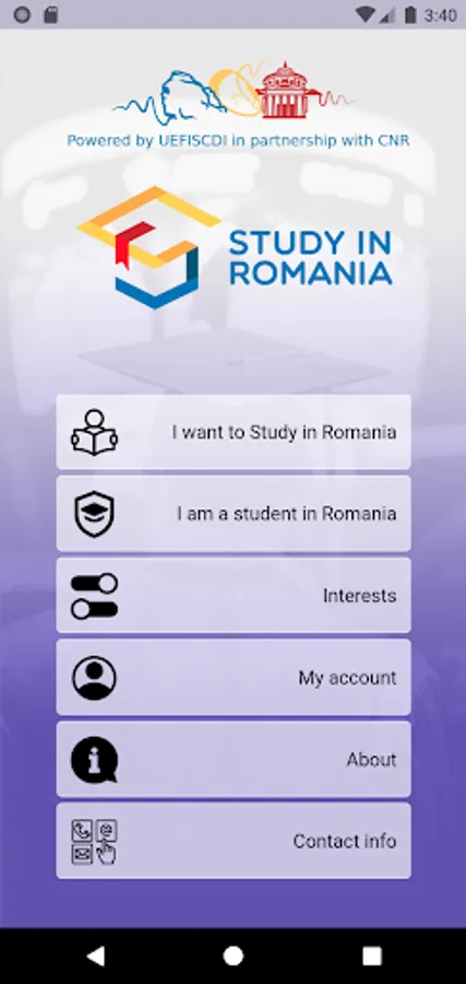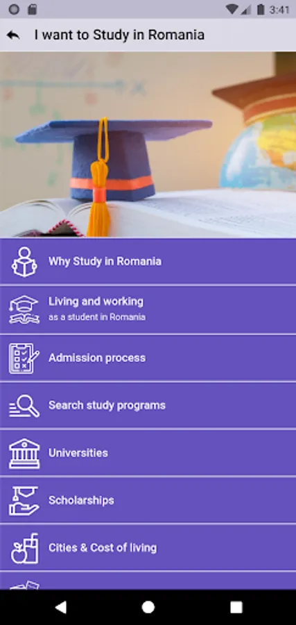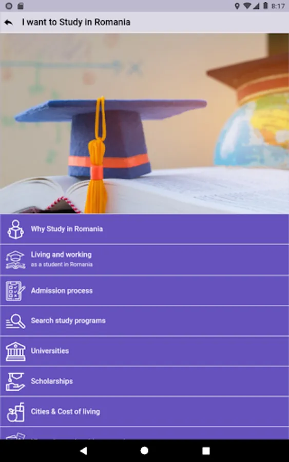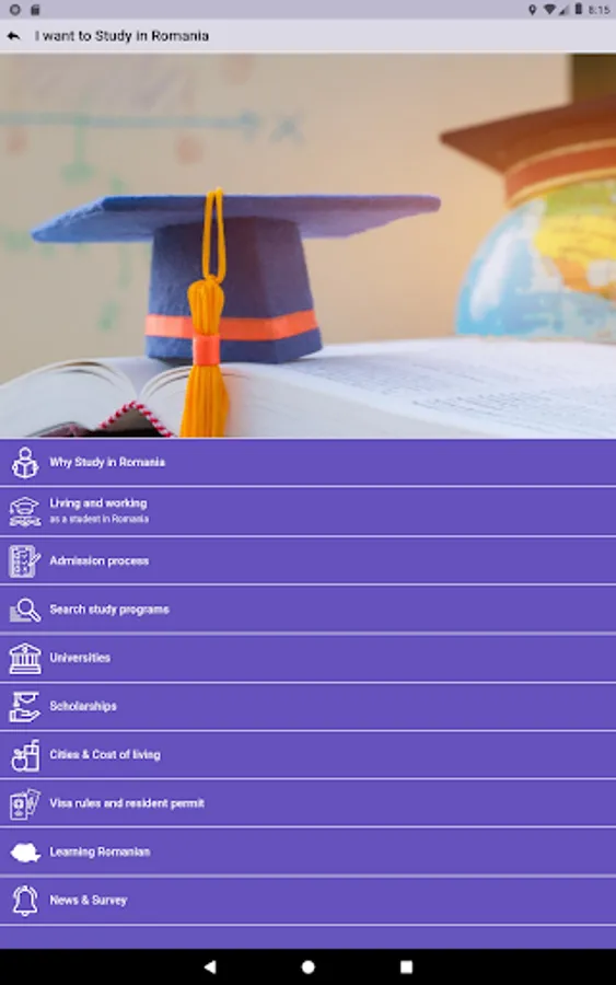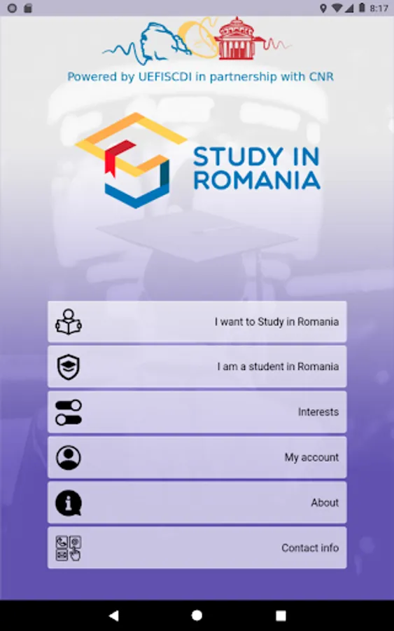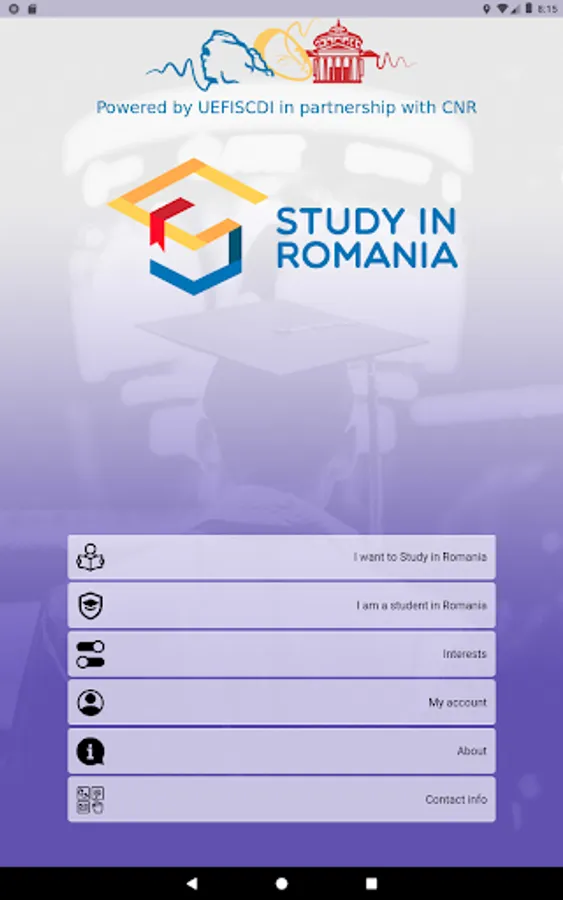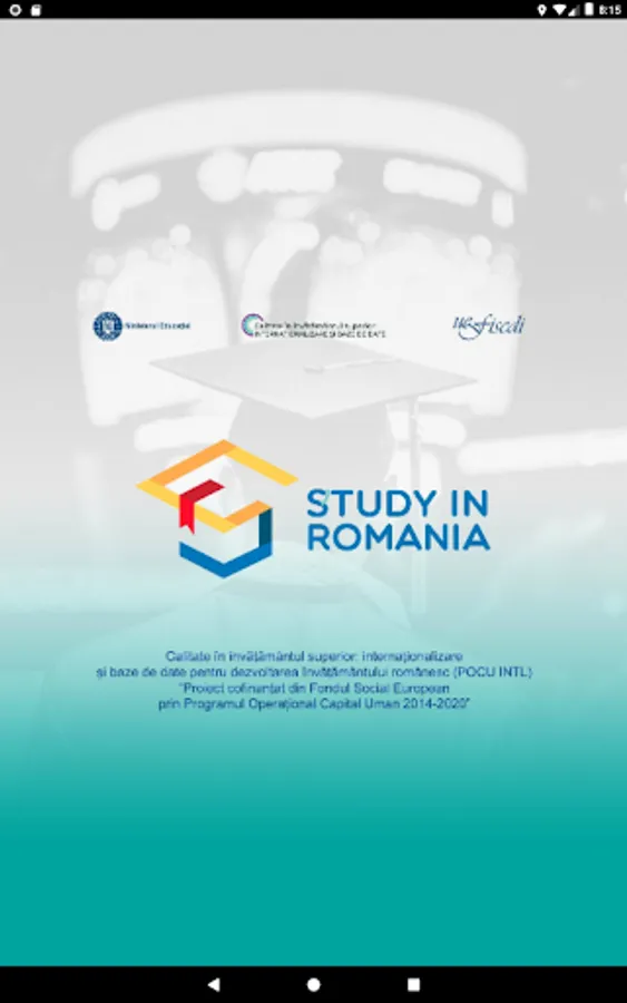 The application offers information on the educational offer of the Romanian universities, details about study programs, admission procedures, scholarships, cities and cost of living.