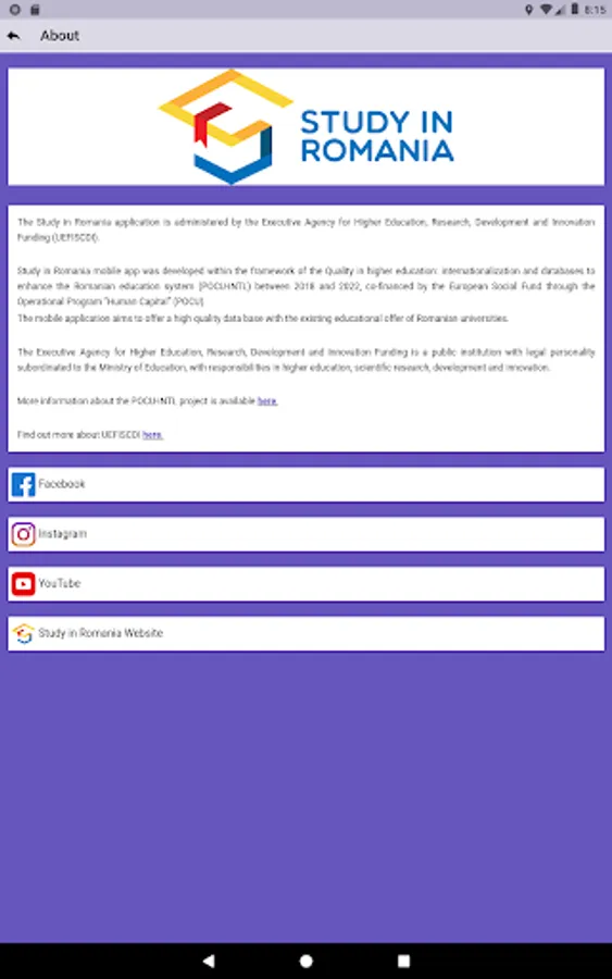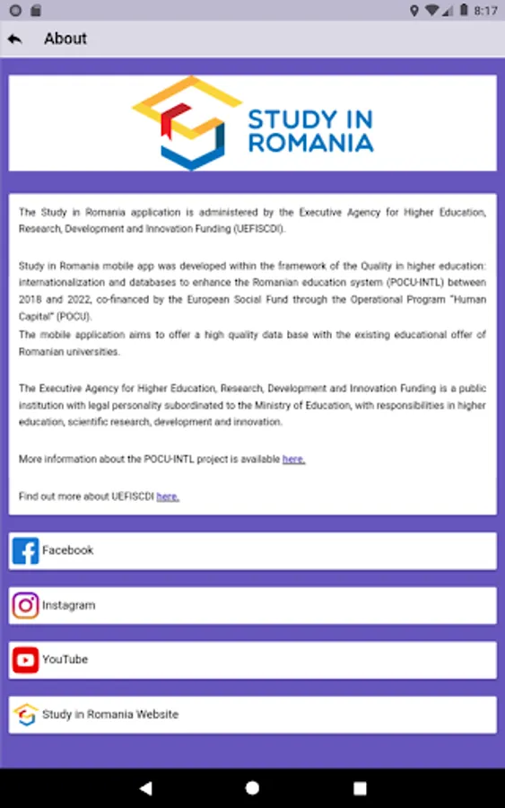 The Study in Romania application is administered by the Executive Agency for Higher Education, Research, Development and Innovation Funding (UEFISCDI).